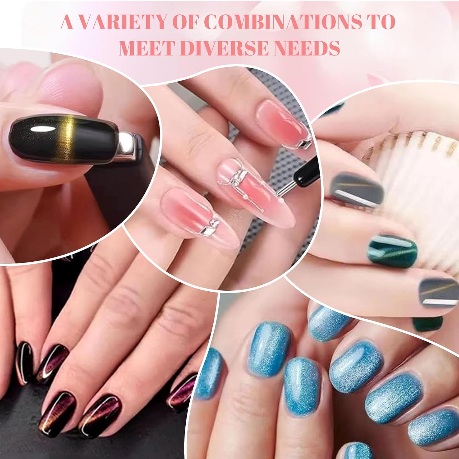 Het bezitten van deze nail art tool set is als het hebben van een paar onzichtbare magische handen, die nauwkeurig het verbazingwekkende kattenoog effect op de nagels kunnen schetsen. Beweeg het gereedschap voorzichtig en de nagellak zal gehoorzaam stromen en samenkomen om een uniek kattenoogpatroon te vormen. Je kunt je verbeelding volledig laten spelen en elementen zoals de diepe en mysterieuze sterrenhemel, romantische en mooie bloemen en gepersonaliseerde geometrische patronen in het nail art-ontwerp opnemen.