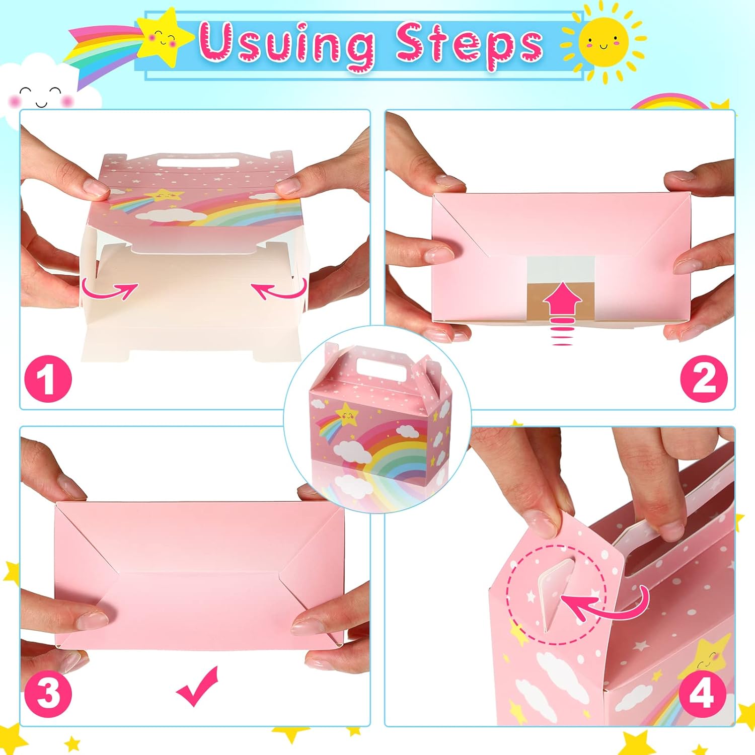 Reliable quality: The rainbow goodie boxes are made of high quality kraft paper, which is safe and reliable, thick and sturdy, with vivid and bright printing, not easy to break or fade, lightweight and no smell, equipped with handles, convenient to carry