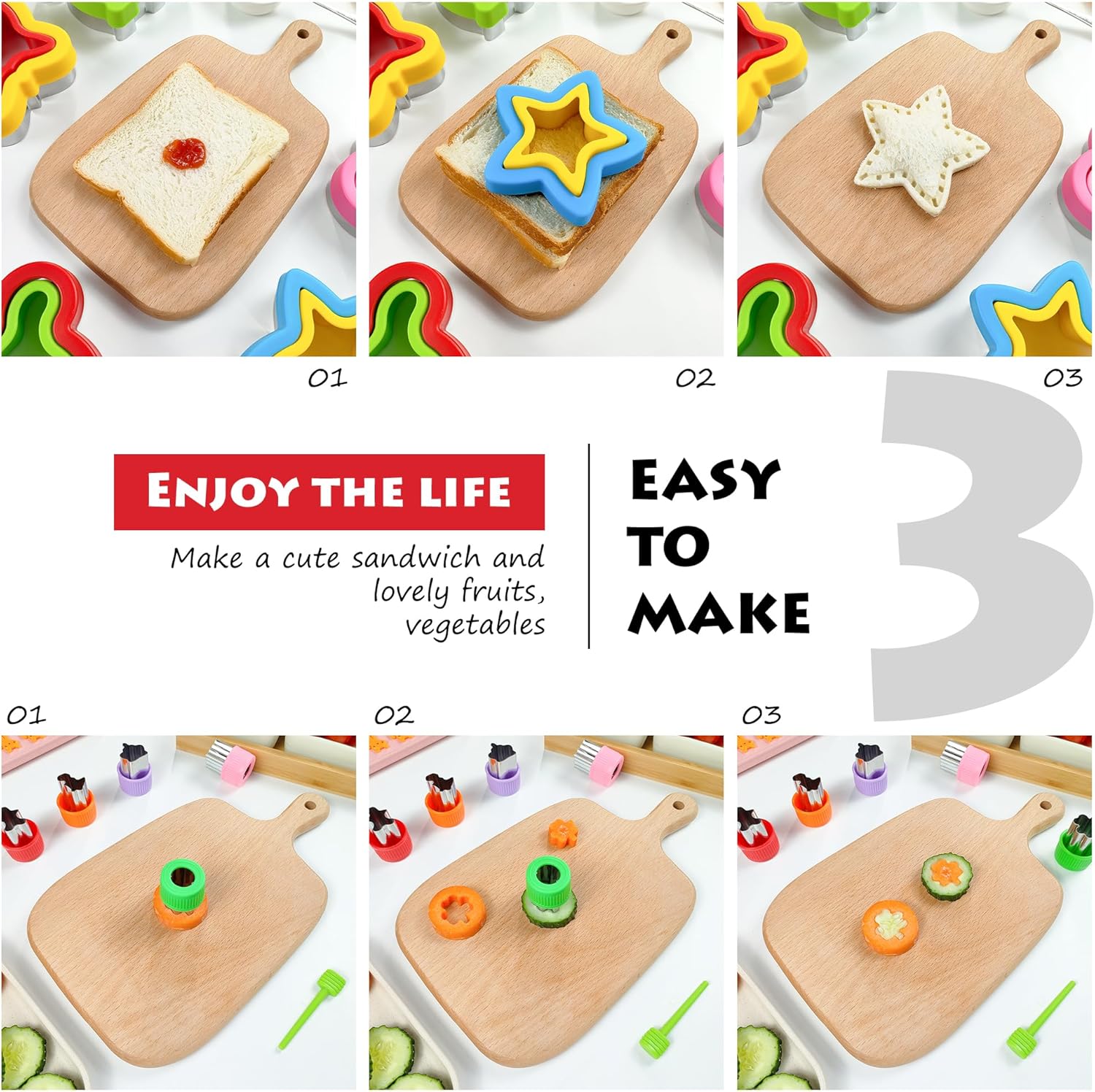 33 cookie cutters for bread and vegetables: the 33-piece cookie cutter set meets the needs of children. Included: 5 large cookie cutters, 1 bear sandwich, 5 fruit and vegetable cutters, 20 fruit forks for children, 1 shape separation pen, 1 brush.