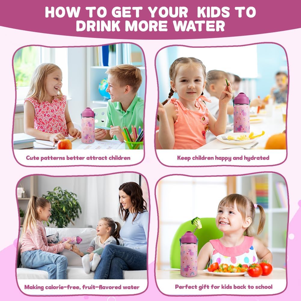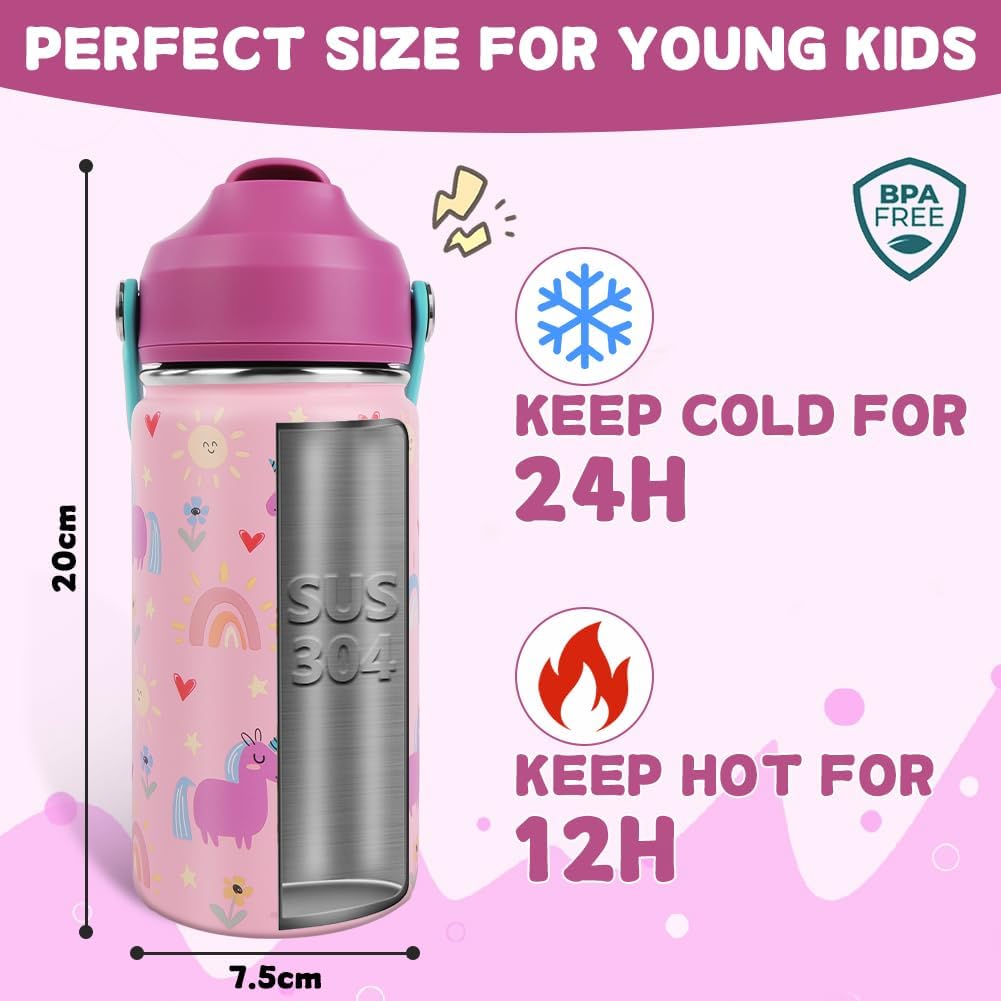 【Excellent Thermal Insulation】With double-layer vacuum insulation technology, the stainless steel water bottle for children can keep the drink hot or cold for a long time, suitable for hot chocolate in winter and refreshing water in summer. It can keep your child’s drinks cold for up to 24 hours and hot for 12 hours.