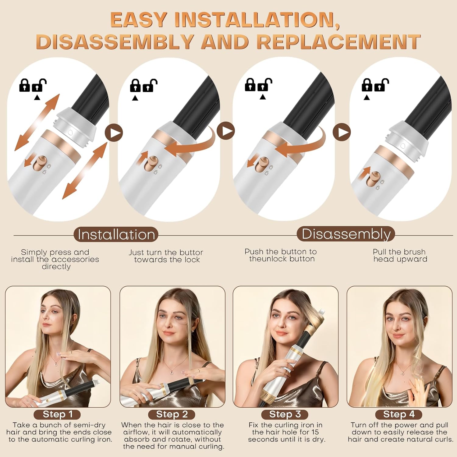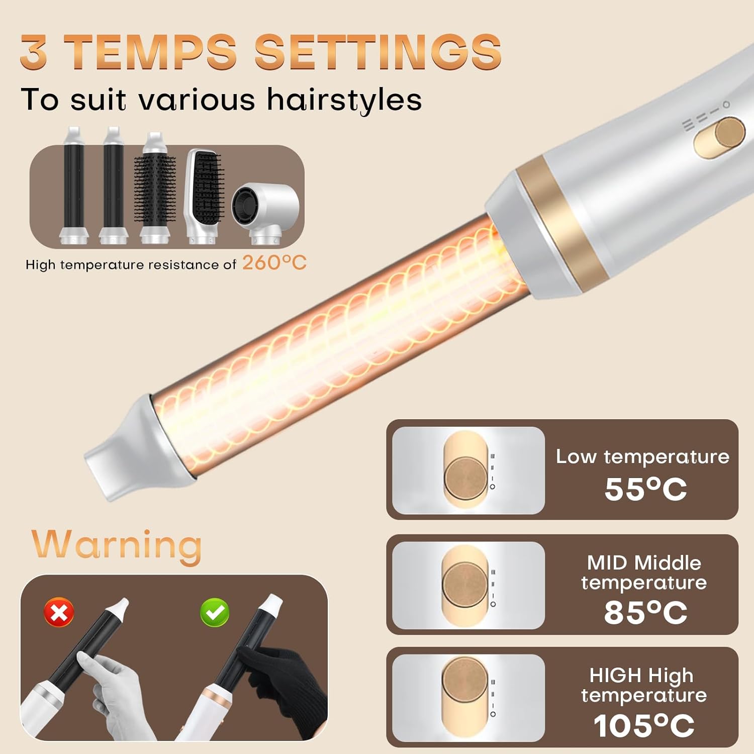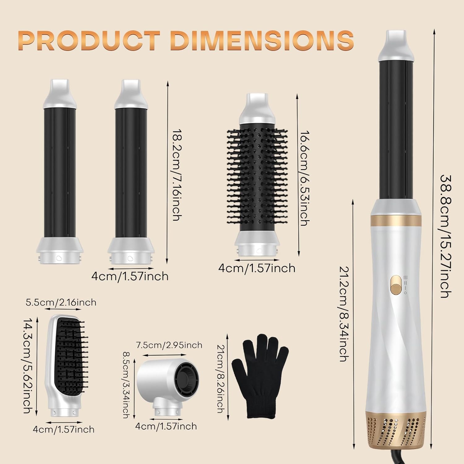 【5-in-1 Air Styler Set】Our 5-in-1 hot air styler includes a hair dryer, 2 auto-wrap curling iron (left and right), a straightening brush and a round volume brush. A heat resistant glove is also included to replace accessories safely and easily. This multifunctional hair styler allows you to dry, curl, straighten hair, give volume and style your hair directly at home with salon results.