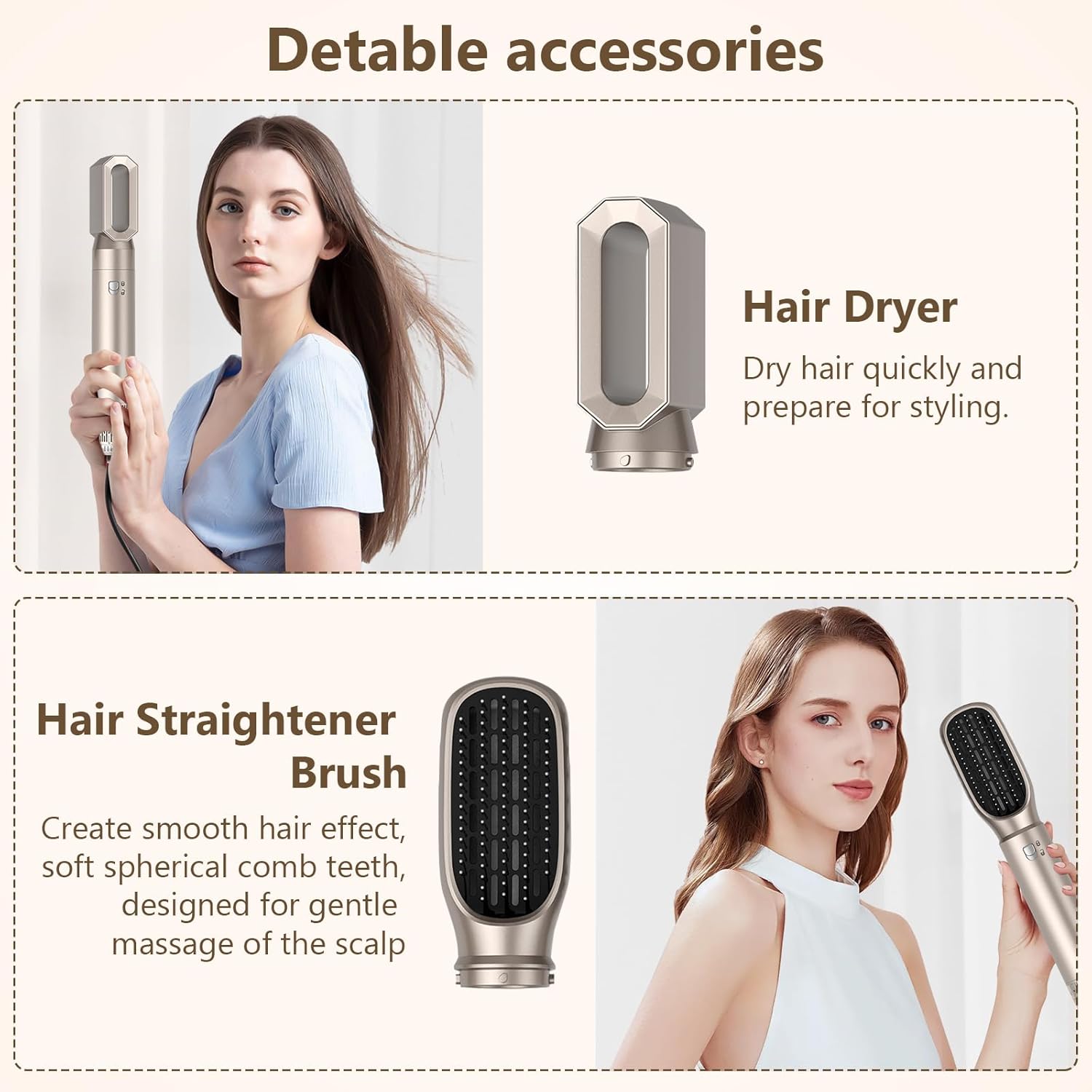 6 in 1 hair dryer styling tools: This 6-in-1 hair styling tool set includes 1 x hair dryer, 1 x hot air brush, 2 x air curling irons, 1 x volume dispenser, 1 x massage straightening brush, removable replacement hair dryer. Wear flammable gloves to avoid burns (you may notice a slight smell in the first minutes after the first use, this is normal and quickly disappears)