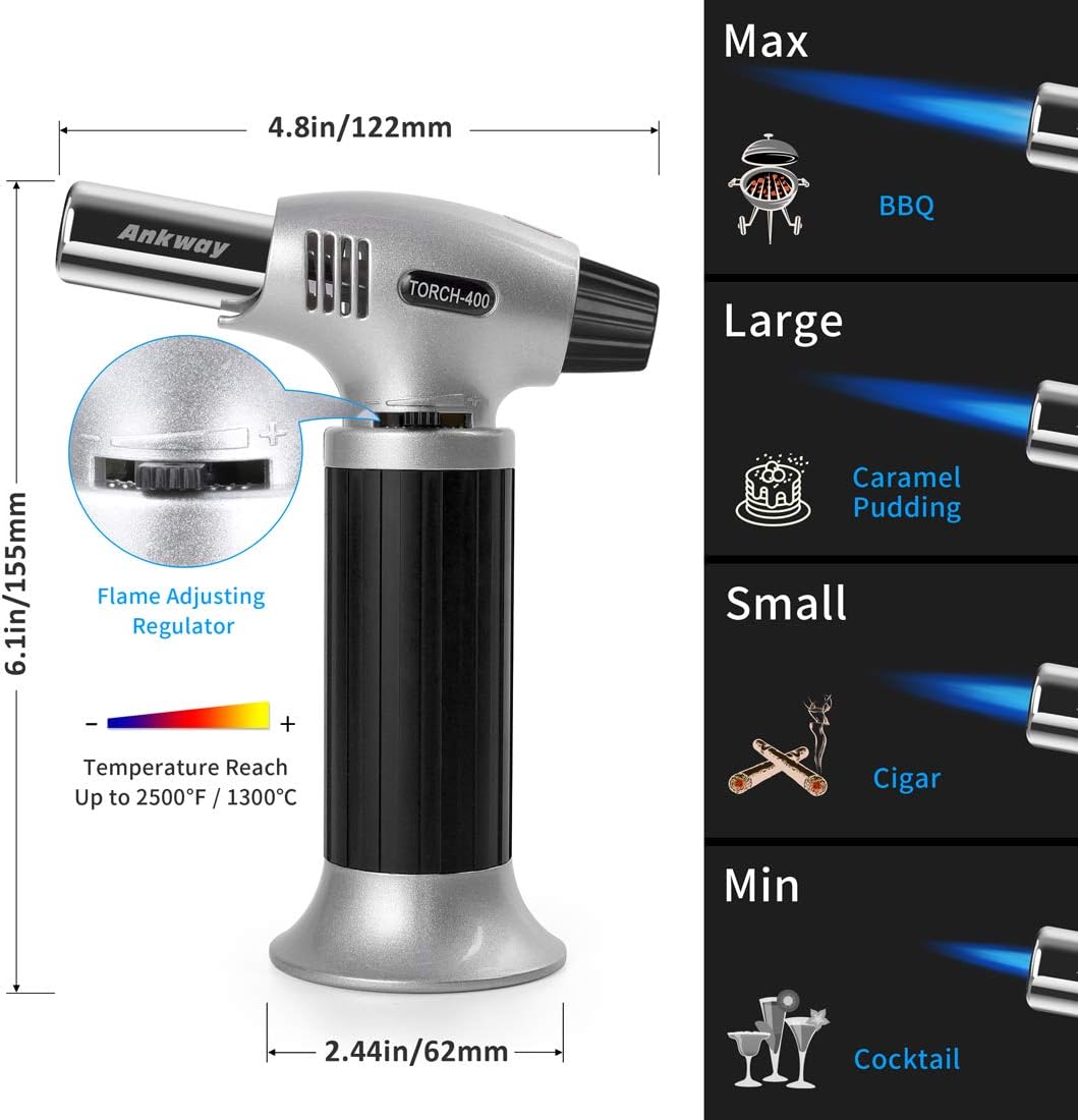 Flambé Burner Bunsen Burner with Safety Lock, Adjustable and Refillable Kitchen Burner for Homemade Creme Brulee, Dessert, Camping, Grilling