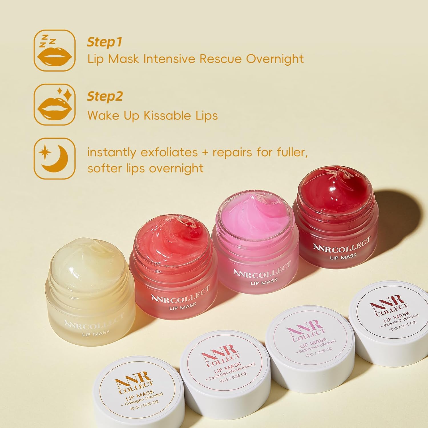 Lip Hydration Therapy — ANRCOLLECT Lip sleep mask delivers intense moisture at night, the secret to waking up with soft, smooth and kissable lips. Moisturizes, soothes and softens your lips at night while you sleep and moisturizes your lips throughout the day. This 4-Pack Lip Therapy Set contains 4 lip sleep masks.