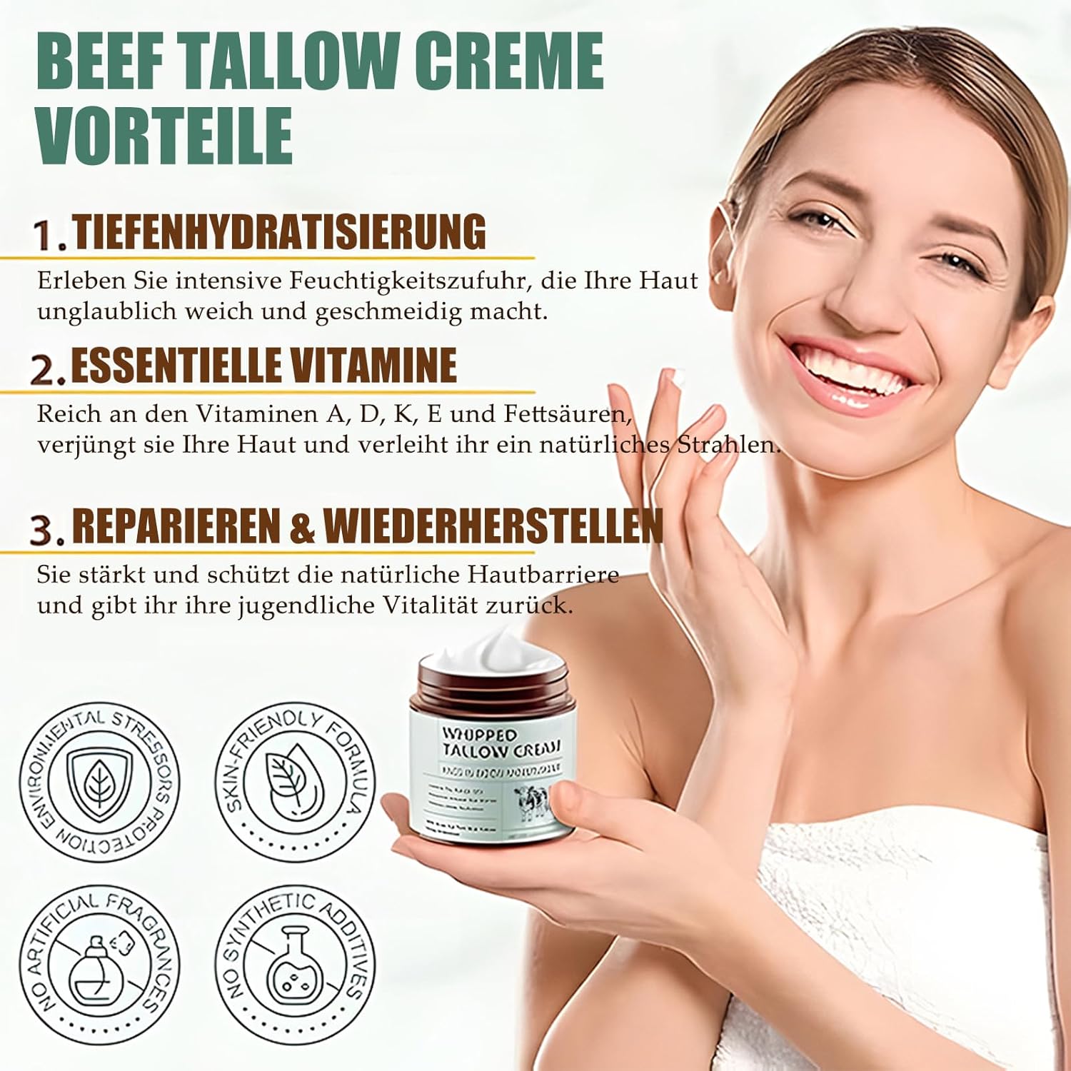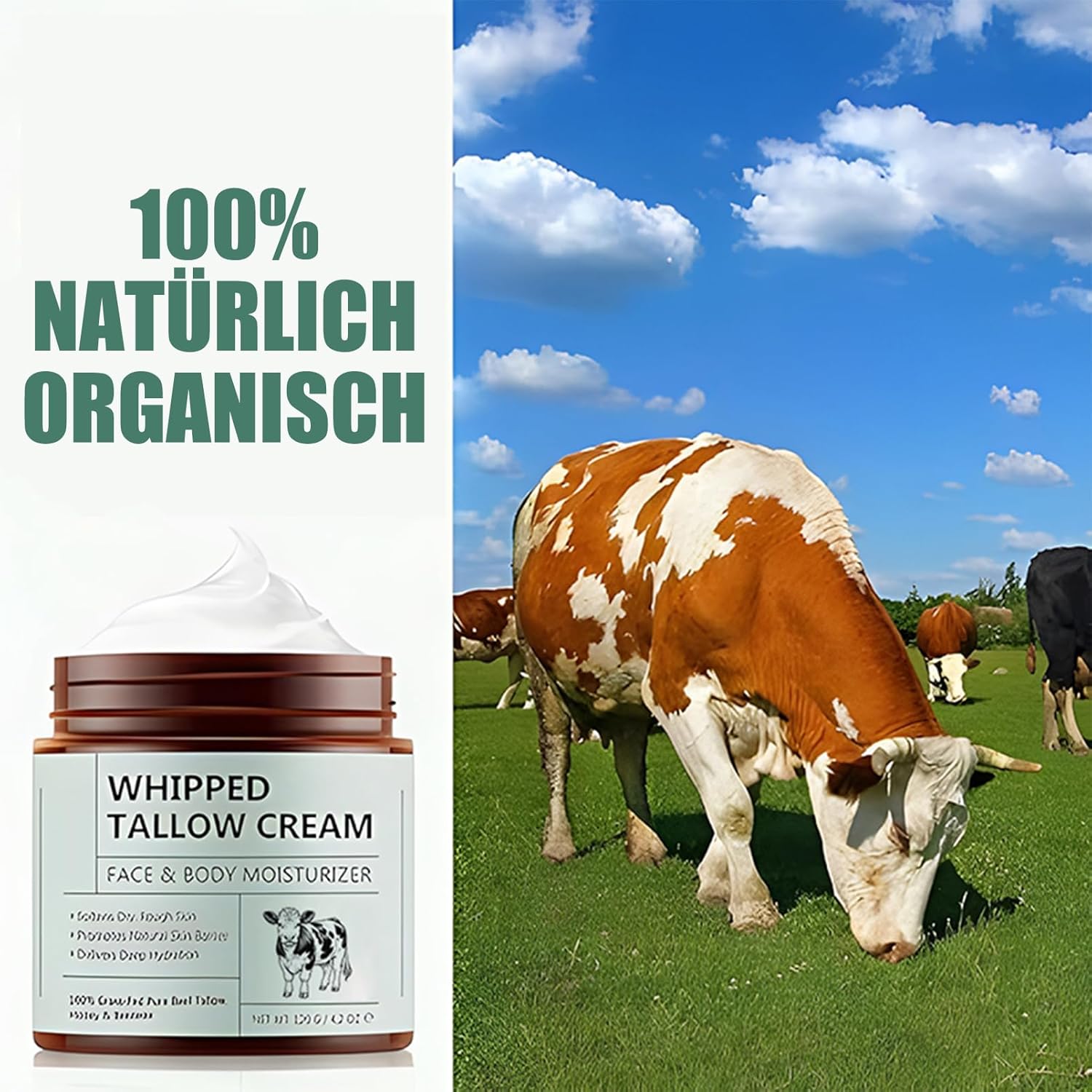 Food-rich grass-Fed Beef Tallow Cream by EONFAVE Beef is made from organic beef tallow from pasture farming and is rich in natural fatty acids and vitamins. It deeply nourishes the skin and improves elasticity and suppleness for an extraordinary caring experience.