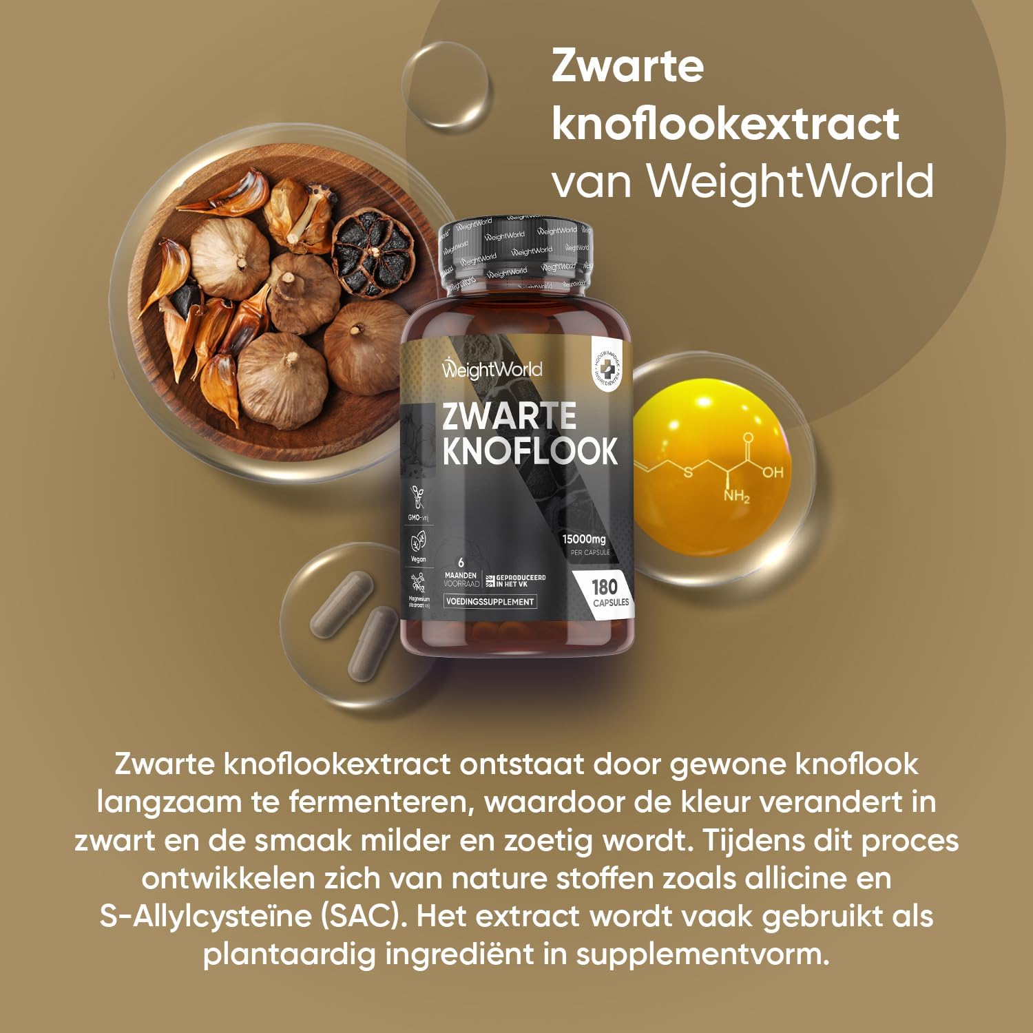 Why black garlic extract? – Black garlic extract is made by slowly fermenting ordinary garlic under controlled conditions. Due to this, the color of the garlic changes to black and acquires a soft, slightly sweet taste. During this process, substances such as allicin and S-Allylcysteine (SAC) naturally arise.