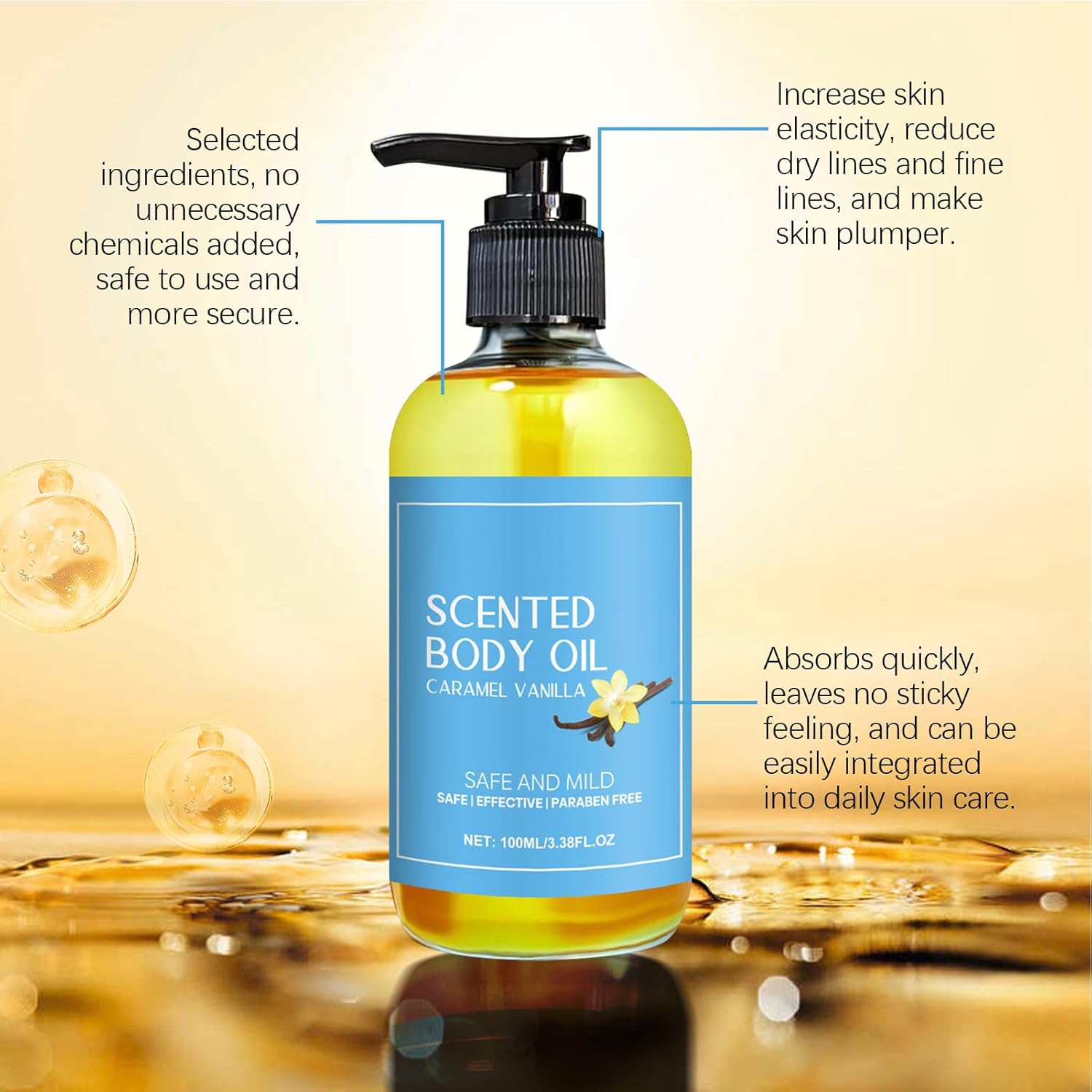 Ideal for daily use, this body oil helps to lock in moisture, providing long-lasting hydration and promoting smooth, healthy skin for both men and women Infused with the goodness of caramel, our body oil effectively rejuvenates your skin, giving you a healthy complexion. With regular use, it helps improve skin elasticity, smoothness, and overall appearance, ensuring you look and feel your best every day