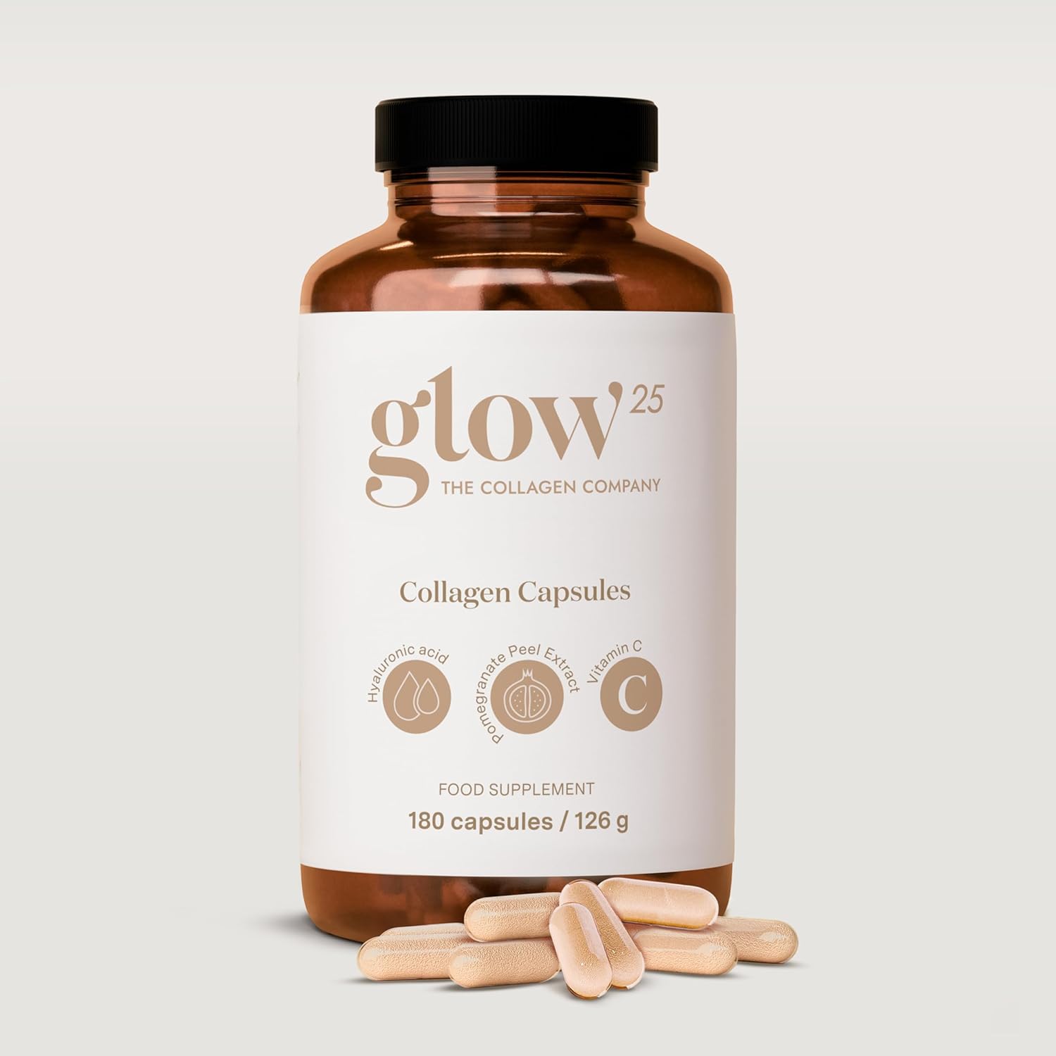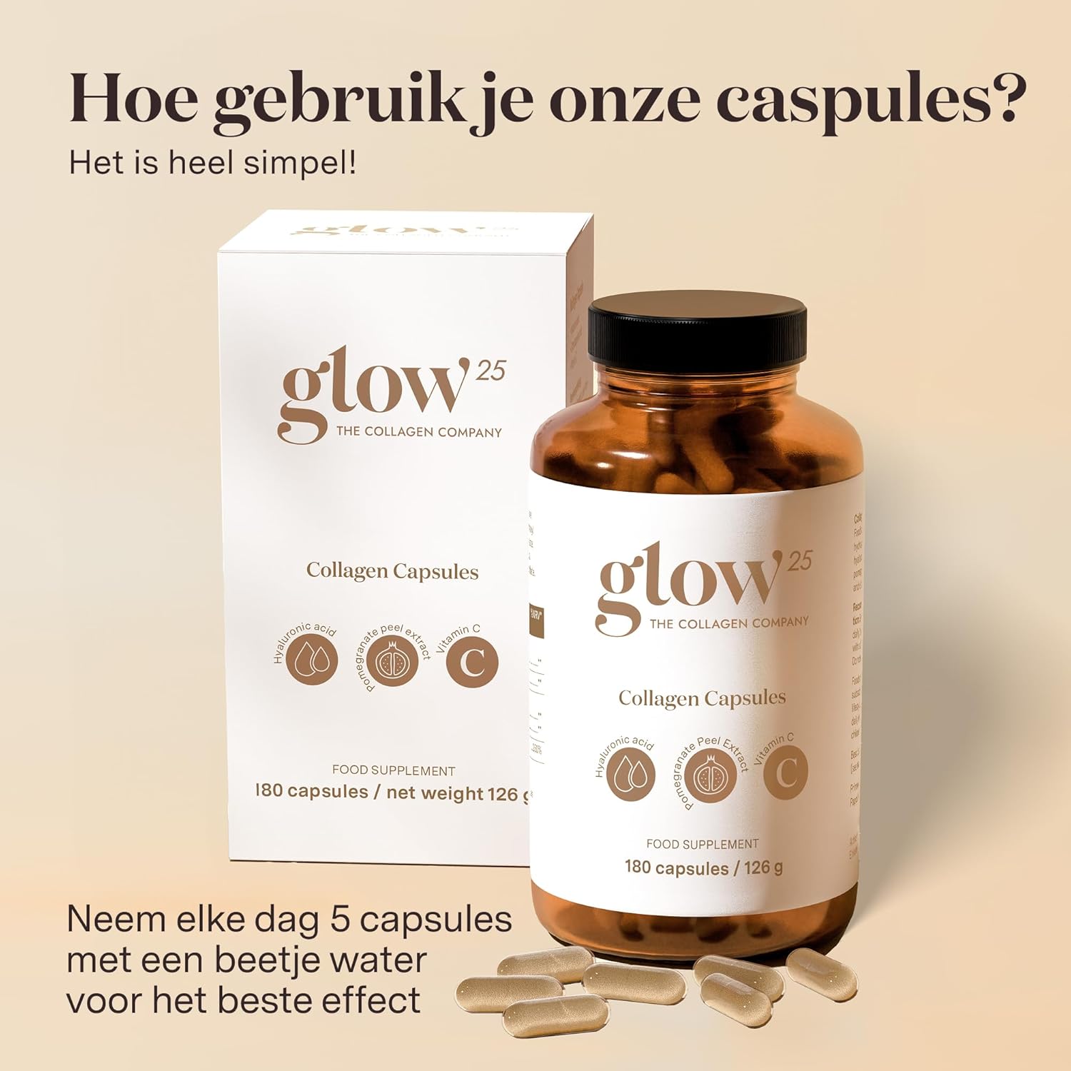 Een krachtige glow-formule: Glow25 combineert collageen type 1, hyaluronzuur, granaatappelextract en vitamine C. Samen versterken ze je natuurlijke schoonheid en laten ze je stralen van binnenuit.