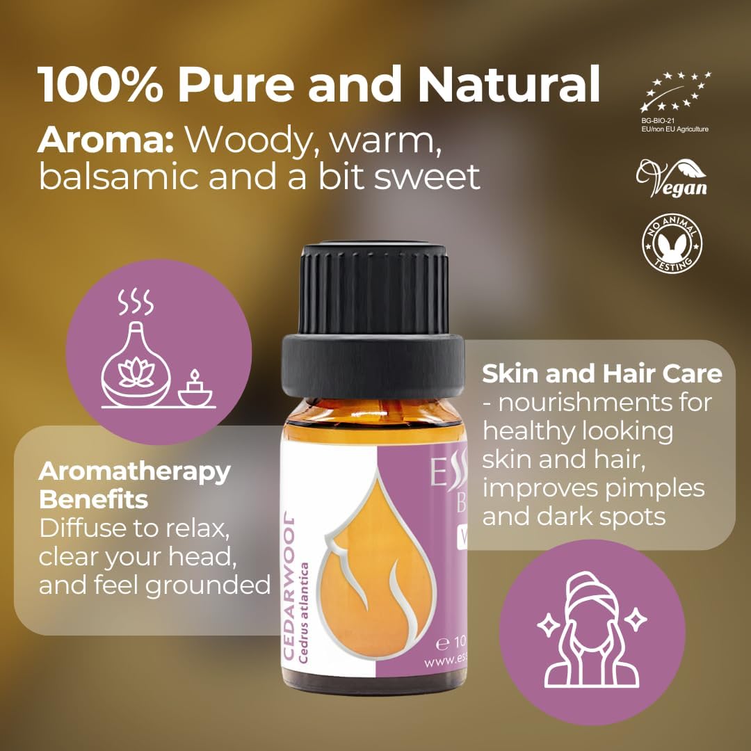 Essences Bulgaria Organic Cedar Wood Essential Oil 10ml | Cedrus atlantica | 100% Pure and Natural | Undiluted | Therapeutic Grade | Aromatherapy | Cosmetics | Cruelty Free | Non-GMO
