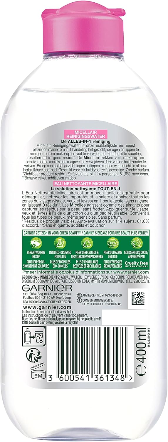 Garnier SkinActive Micellar Cleansing Water for Sensitive Skin – Mild Facial Cleansing – Gentle Make-Up Remover – 400ml A facial cleanser suitable for the most sensitive skin and perfect as a make-up remover. Product Description Remove makeup and cleanse your skin in one stroke with Garnier SkinActive Micellar Cleansing Water. Micellar cleaning water is a substitute for the use of cleaning wipes. Cleanses and softens sensitive skin Removes makeup in one stroke without much rubbing and irritations Mild makeup remover without perfume and alcohol* Facial cleansing without drying out the skin thanks to its moisturizing effect The easiest way to cleanse the face, eyes and lips in one action and remove makeup, without rubbing and rinsing. This perfume-free, moisturizing formula cleanses the skin without drying it out. The result The following results are achieved in one micellar water action: Sensitive skin is cleansed Makeup is removed without rubbing or rinsing off hard Skin feels soft and hydrated The benefits for sensitive skin Garnier Micellar Cleansing Water is a facial cleanser with a gentle, perfume-free formula and is suitable for all skin types, including the most sensitive skin. The micelles attract dirt like a magnet, removing dirt and impurities such as excess sebum from your face. In addition, the Micellar Cleansing Water does not contain alcohol, which makes the product suitable for all areas of the face, without irritation.