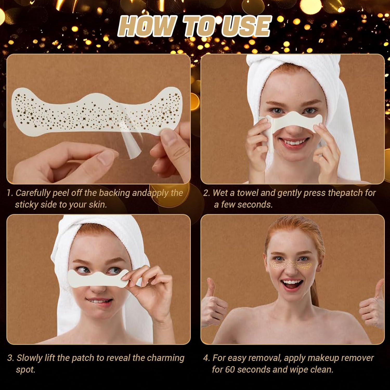 3.Quick application: Simply peel off the back, place on clean skin, moisten and peel off after 30 seconds – and golden or colorful glitter freckles sparkle on your face. Perfect for festival makeup in seconds – without makeup brush!