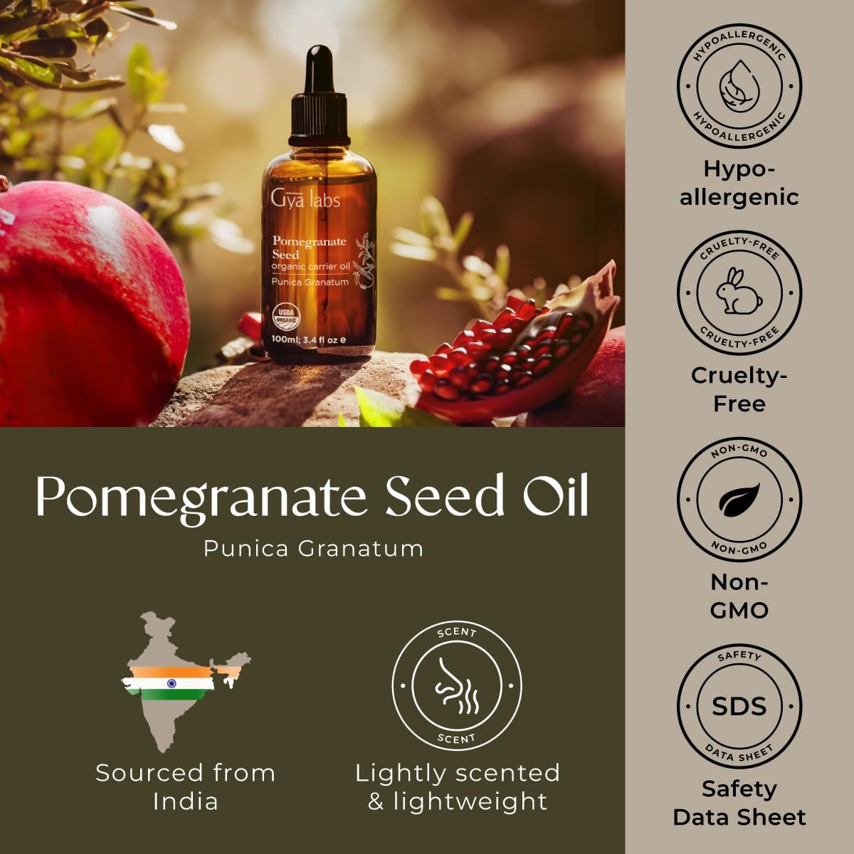 TESTED FOR SAFETY AND QUALITY. Pomegranate oil from Gya Labs is 100% organic and unrefined and is thoroughly tested by GC/MS, MSDS, COA, USDA, etc. Perform a patch test before use. Seek medical advice before using it in pets, children and during pregnancy.