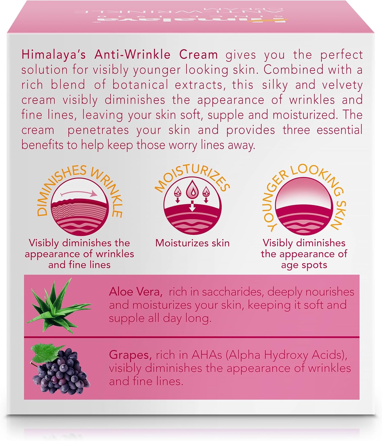 Himalaya Herbals Anti-rimpelcrème biedt u de perfecte oplossing voor een jonger uitziende huid. Gecombineerd met een rijke mix van botanische extracten vermindert deze zijdezachte en fluweelzachte crème rimpels en fijne lijntjes, waardoor uw huid zacht, soepel en gehydrateerd blijft. deze crème dringt diep door in je huid en biedt drie essentiële voordelen om die zorglijntjes weg te houden. Vermindert rimpels en fijne lijntjes. Hydrateert de huid. Helpt ouderdomsvlekken te verminderen.