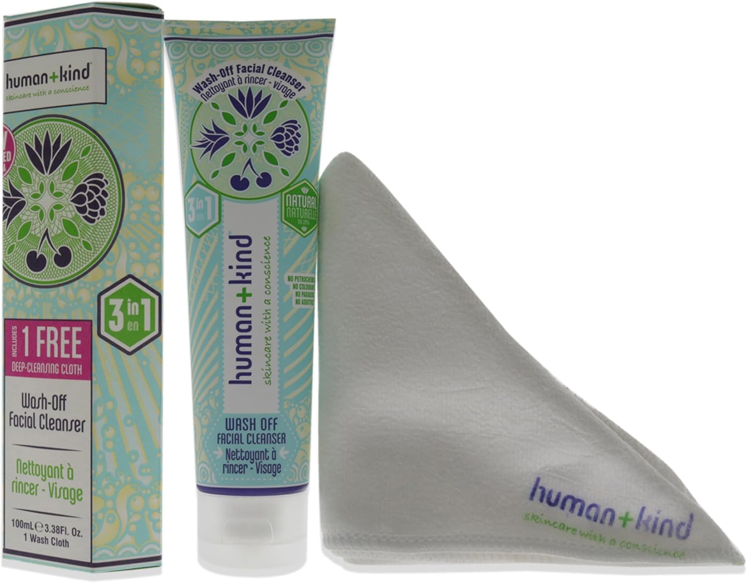 Human + Child Wash-Off Face Cleansing, All-In-One Formula, Cleanses, Removes Makeup and Peels, with Super Soft Deep Cleansing Cloth, Natural, Vegan Facial Care, 100 ml