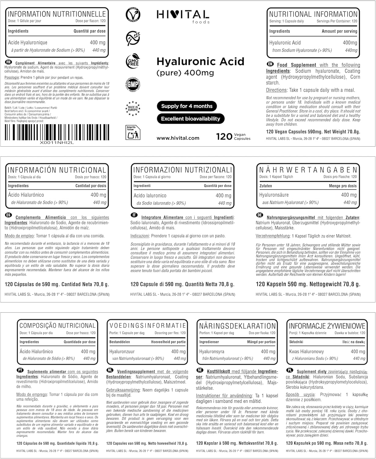 MAXIMUM QUALITY AND QUANTITY: Our product is 100% Vegan, Gluten Free, Lactose Free, Soy Free, Magnesium Stearate Free, Sugar Free, No preservatives or dyes, No added flavors, No GMO. MANUFACTURED IN EUROPE under GMP and ISO certificates. Hivital Foods is registered with AESAN with number 26.019181B.