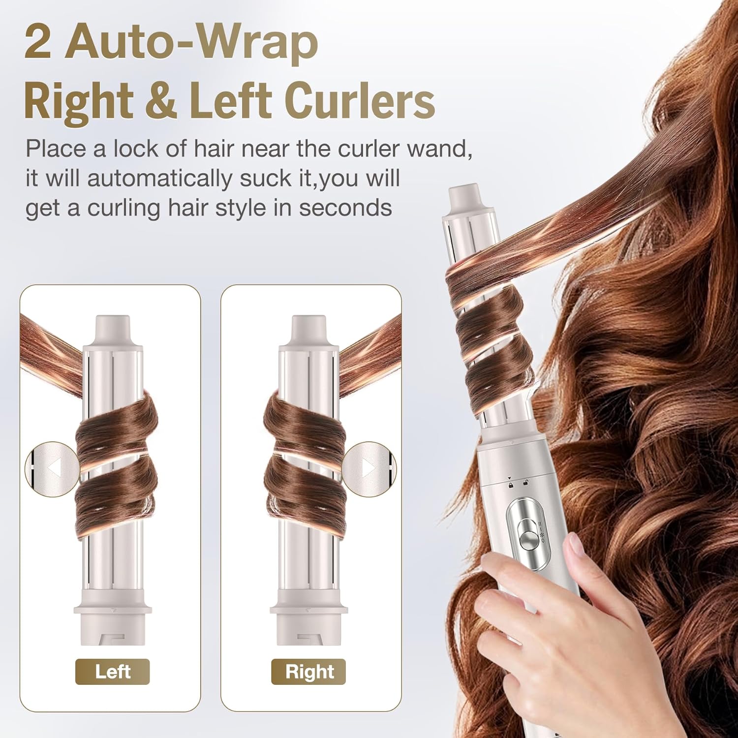 Automatic winding curling iron: The air curling iron is removable and can be used as a travel curling iron when you need to go. Some tips for using an automatic curling iron: 1. Hold a small section of hair, about 10 cm from the ends. 2. Bring the hair to the curling iron, the hair will begin to curl. 3. Start curling from the tip of the hair and bring it to the head. 4. Hold the air styler in place for 15 seconds.