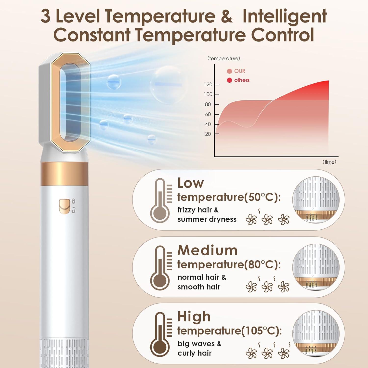 ● The hot air brush set is a high-quality body care device that integrates blow-drying, smoothing, curling, perming and hot air combs. Equipped with five interchangeable brush heads, you can choose depending on the styling effect and the need and easily form smooth, smooth hair or large waves.