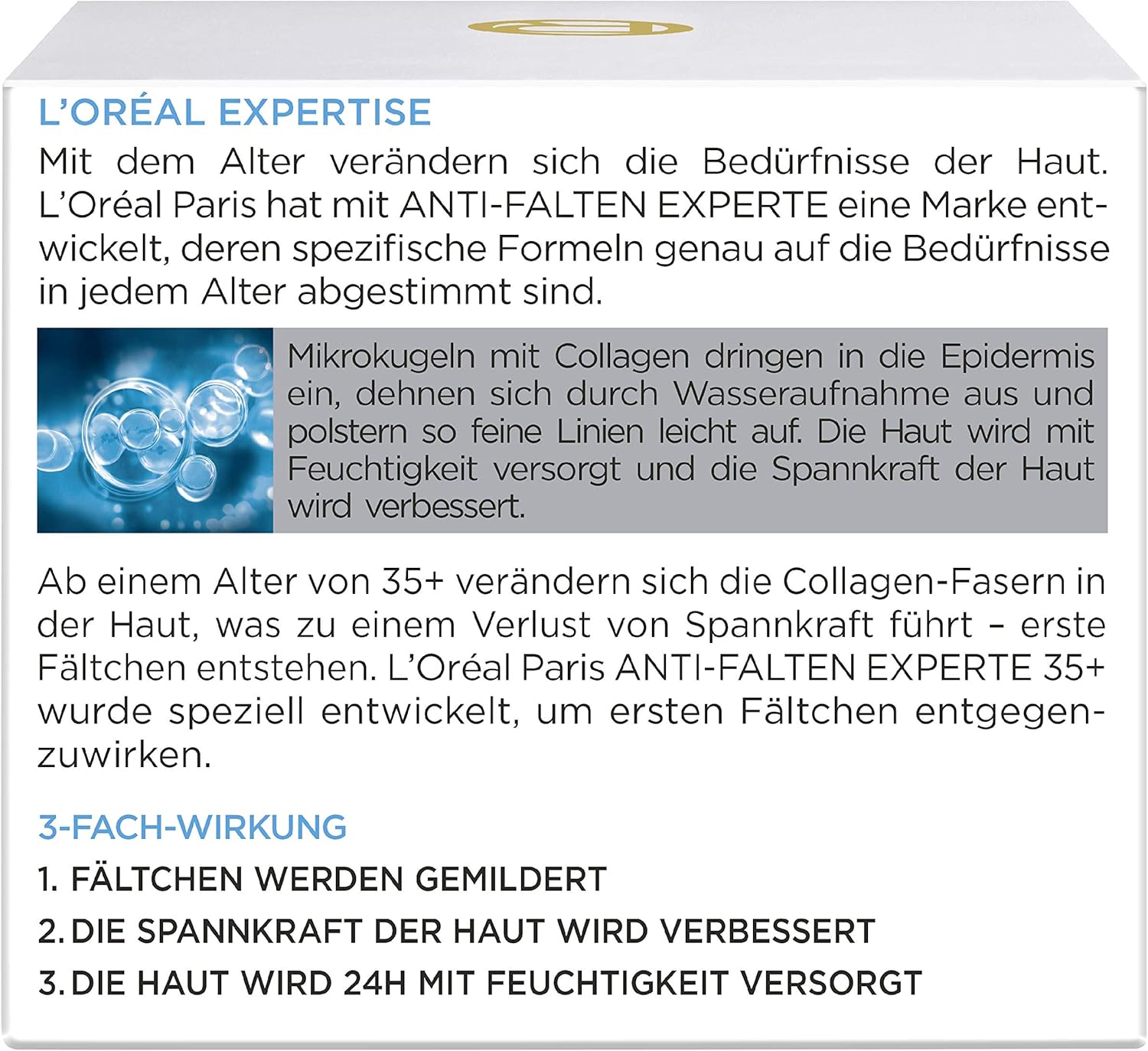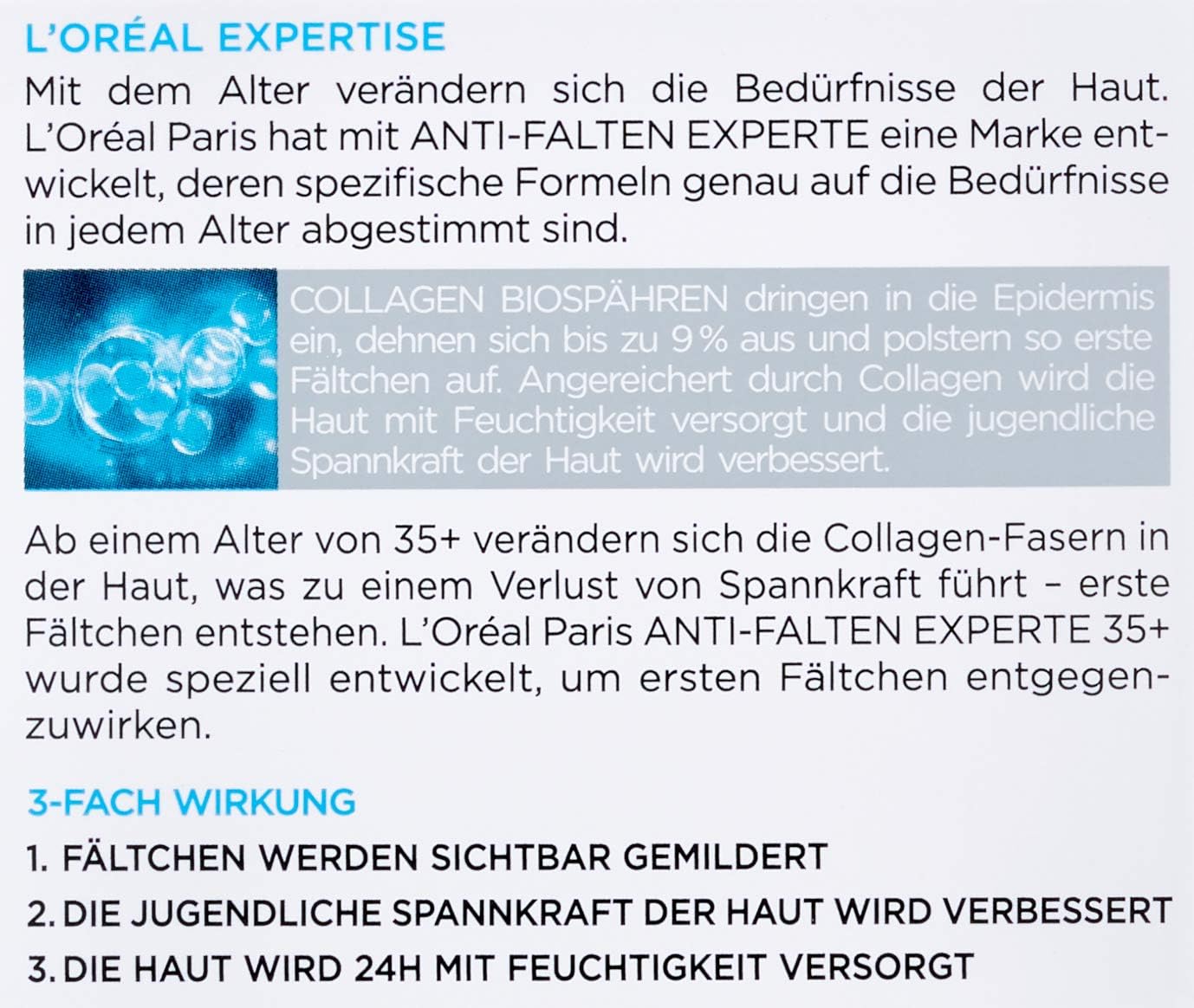De behoeften van de huid veranderen met de leeftijd. Vanaf de leeftijd van 35+ veranderen de collageenvezels in de huid, wat leidt tot verlies van elasticiteit – de eerste rimpels verschijnen. De anti-rimpel expert 35+ moisturizer van L’Oréal Paris gaat de verschillende tekenen van veroudering tegen en verfrist de huid. Toepassing: dagelijks ‘s morgens en’ s avonds met cirkelvormige bewegingen op het gereinigde gezicht aanbrengen. Leveringsomvang: 1x 50 ml anti-rimpel 35+ – een anti-rimpel moisturizer die een fluweelzachte huid oproept.