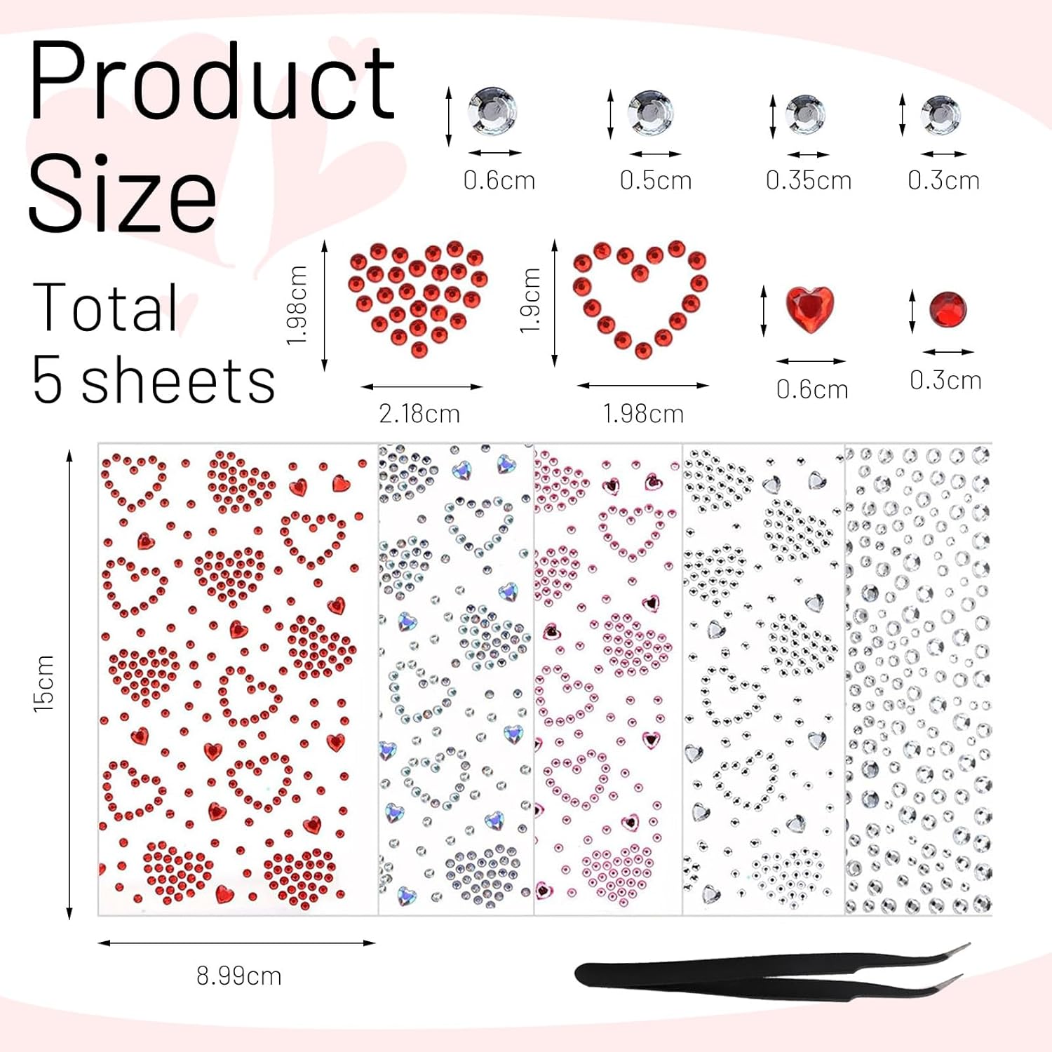 LunarCharm 5 Sheets Face Gemstones, Hair Gemstones, Self Adhesive Face Jewelry Stickers, Heart Festival Face Gemstones for Sticking, Rhinestones for Face