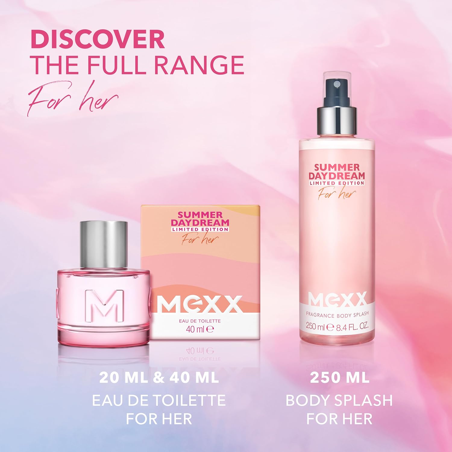 MEXX Summer Daydream eau de toilette for women is a dreamy, floral and fruity fragrance reminiscent of a carefree summer feeling, when the warmth of the sun reminds you to take it slow… Let this limited edition fragrance take you to a serene summer day, where a soft pink sky is reflected in a brilliant lake. With each spray you step into a summer fantasy world and dream away. Offering a beautiful combination of soft floral notes and lush fruit notes, Mexx Summer Daydream for women is based on a feminine bouquet of rose petals with notes of fresh freesia and sweet jasmine. A juicy accord of raspberry and pomegranate gives the fragrance an irresistible fruity look. As the fragrance unfolds, woody and amber notes spread a rich warmth. The cylindrical vial has a soft pink hue reminiscent of summer blossoms and berries. The vial is packaged in a cardboard box, decorated with wavy pink and peach shades reminiscent of warming sun rays. On the back of the package is a silhouette of the vial, filled with illustrations of the ingredients of the fragrance. Summer Daydream has a vegan formula and is dermatologically tested. The cardboard of the packaging comes from certified sustainable forest management.