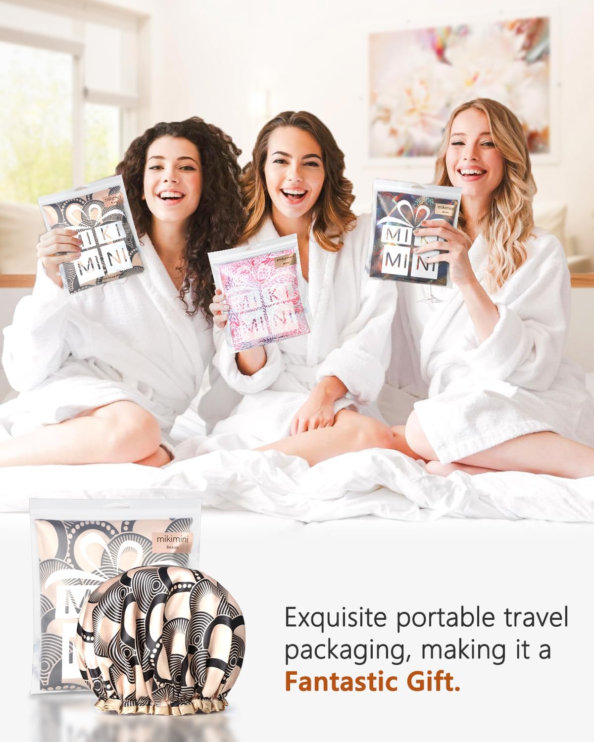 mikimini reusable shower cap for women with long hair, elastic band with firm fit, champagne print large double waterproof and washable hair protection for thick hair