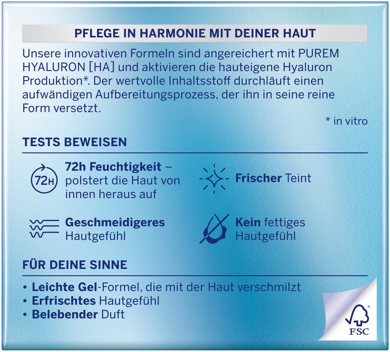 Thanks to its lightweight formula, the face cream moisturizes for up to 72 hours and fills the skin with moisture from the inside. This ensures visibly smoother skin and a fresher-looking complexion without leaving greasy residue on the skin. The light texture of the gel mixes with the skin leaving a feeling of freshness. In addition, the delicate fragrance stimulates the senses with each use. Skin compatibility dermatologically tested.
