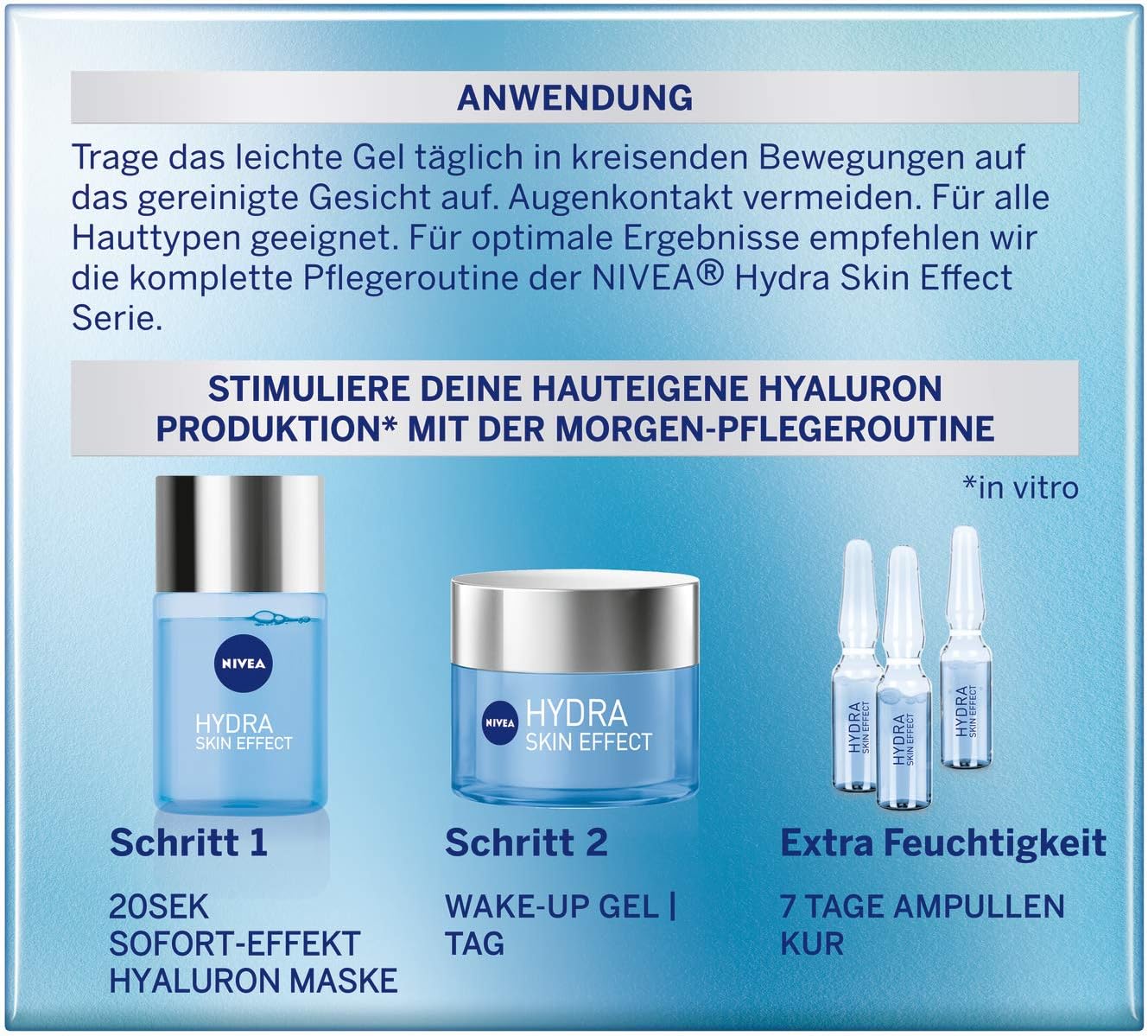 Box contents: Nivea Hydra Skin Effect Wake-up Gel, 50 ml, day cream gel for visibly smoother skin and a fresher complexion, without greasy skin feeling, item number 94201