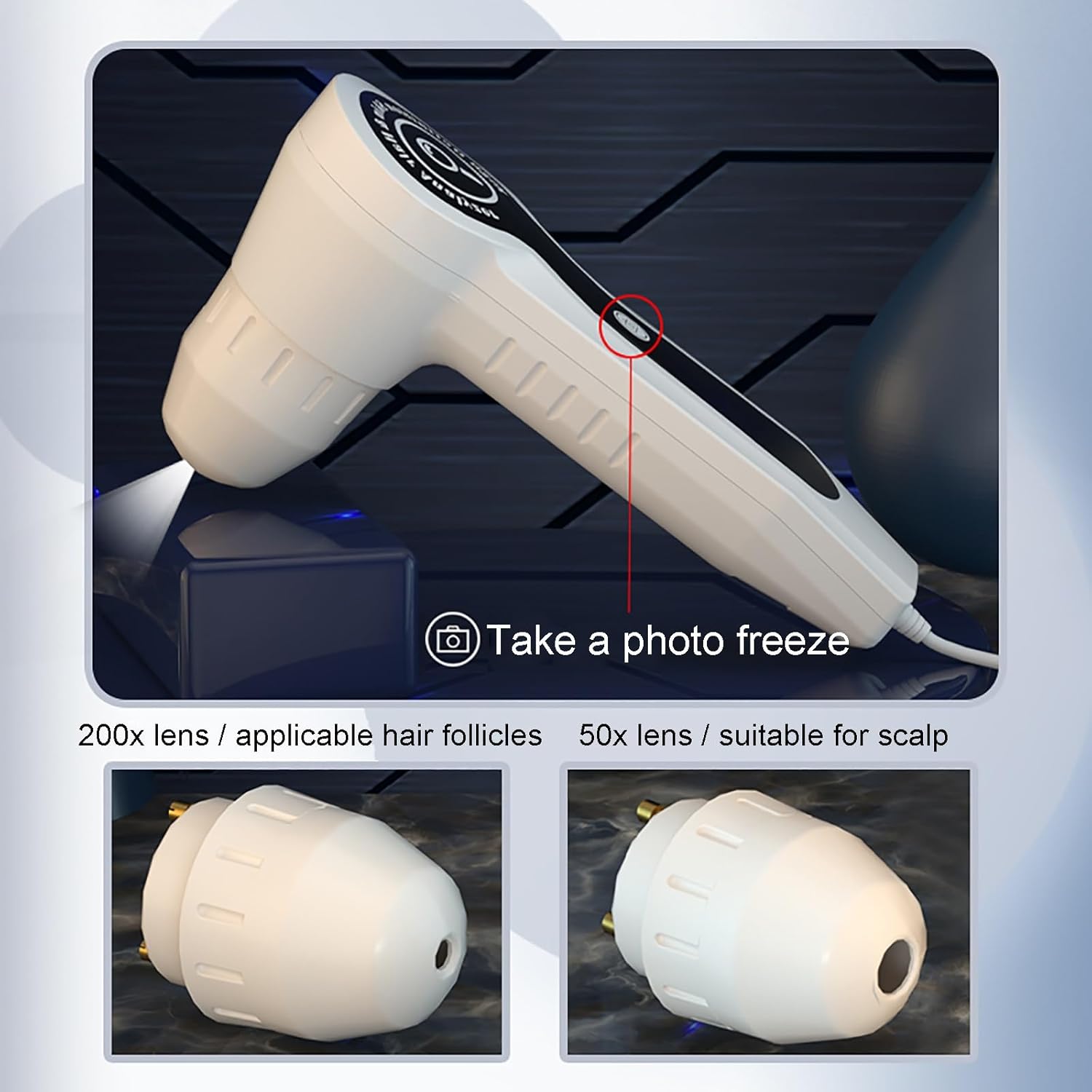 Nauwkeurigheid met dubbele lens: De haar- en huidanalysator is uitgerust met twee lenzen, 50x for huiddetectie en 200x for haardetectie. Multifunctionele dubbele lens, detectie van haarzakjes en hoofdhuiddetectie. Twee lenzen kunnen naar wens worden verwisseld, wat zorgt for veelzijdigheid en nauwkeurigheid.