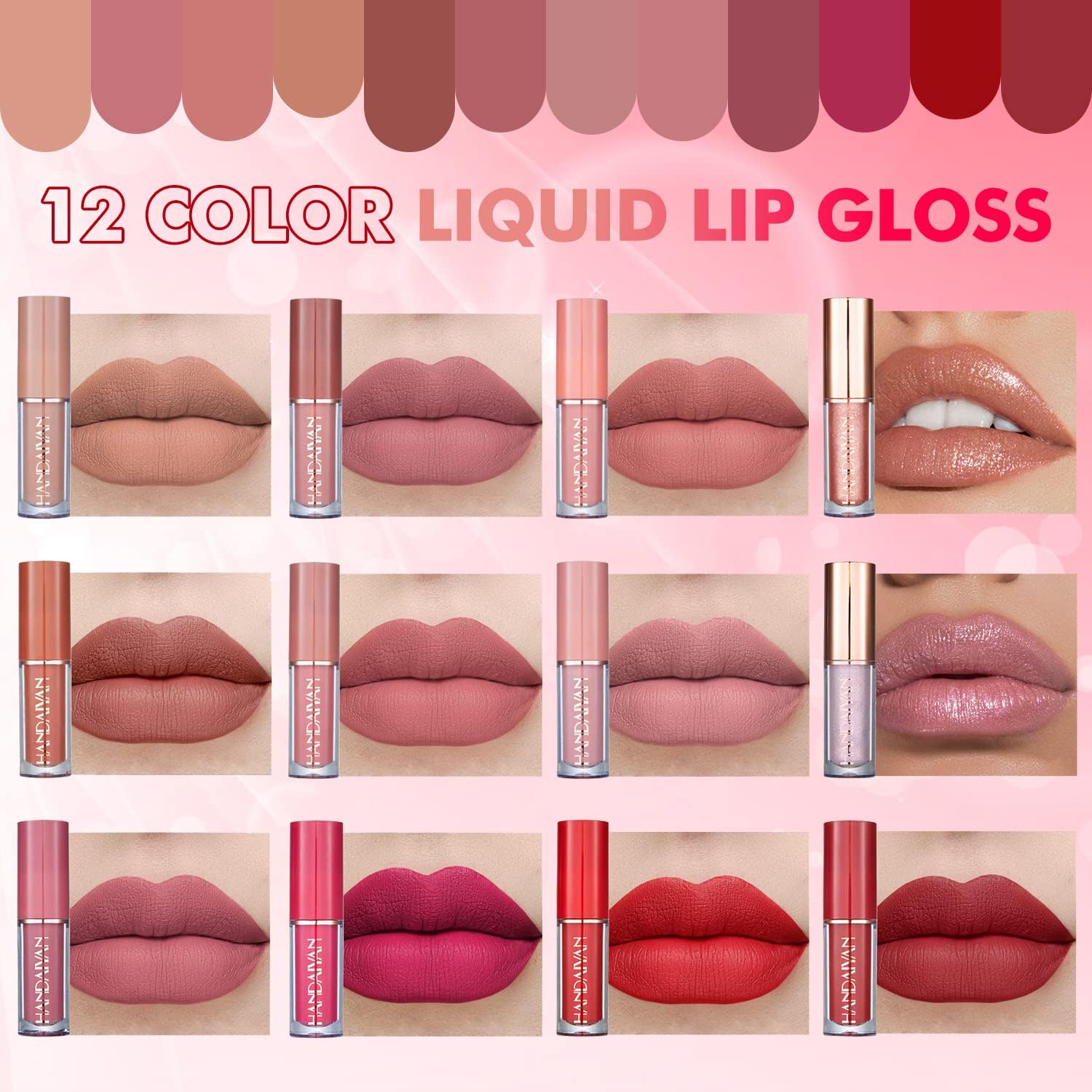 12 rijke kleuren van de lipgloss-set, heldere kleuren met matte afwerking, maken je glamoureus en zelfbewuster.