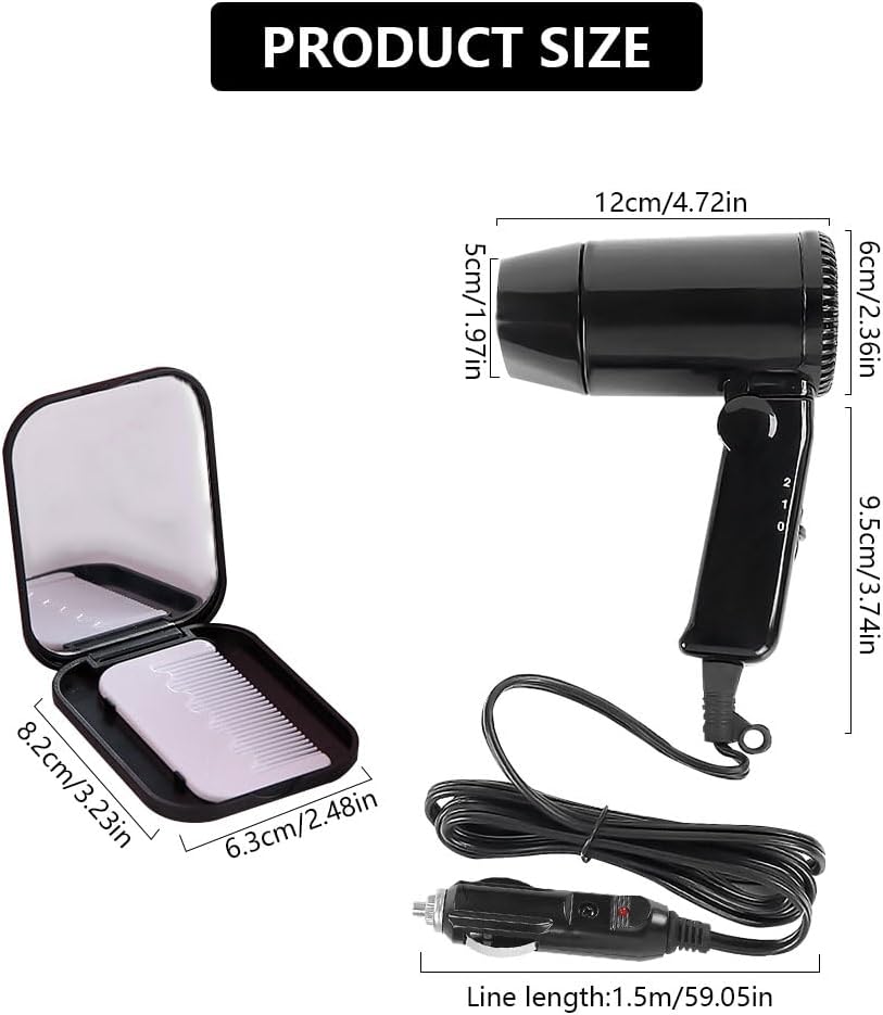 12 V haardroger voor de auto, opvouwbaar, 12 V föhn, auto, 120 W, reisföhn auto met spiegelkam, 1,5 m sigarettenaansteker, 2 windstanden, mini-haardroger 12 V voor auto, camper, camping, reizen,