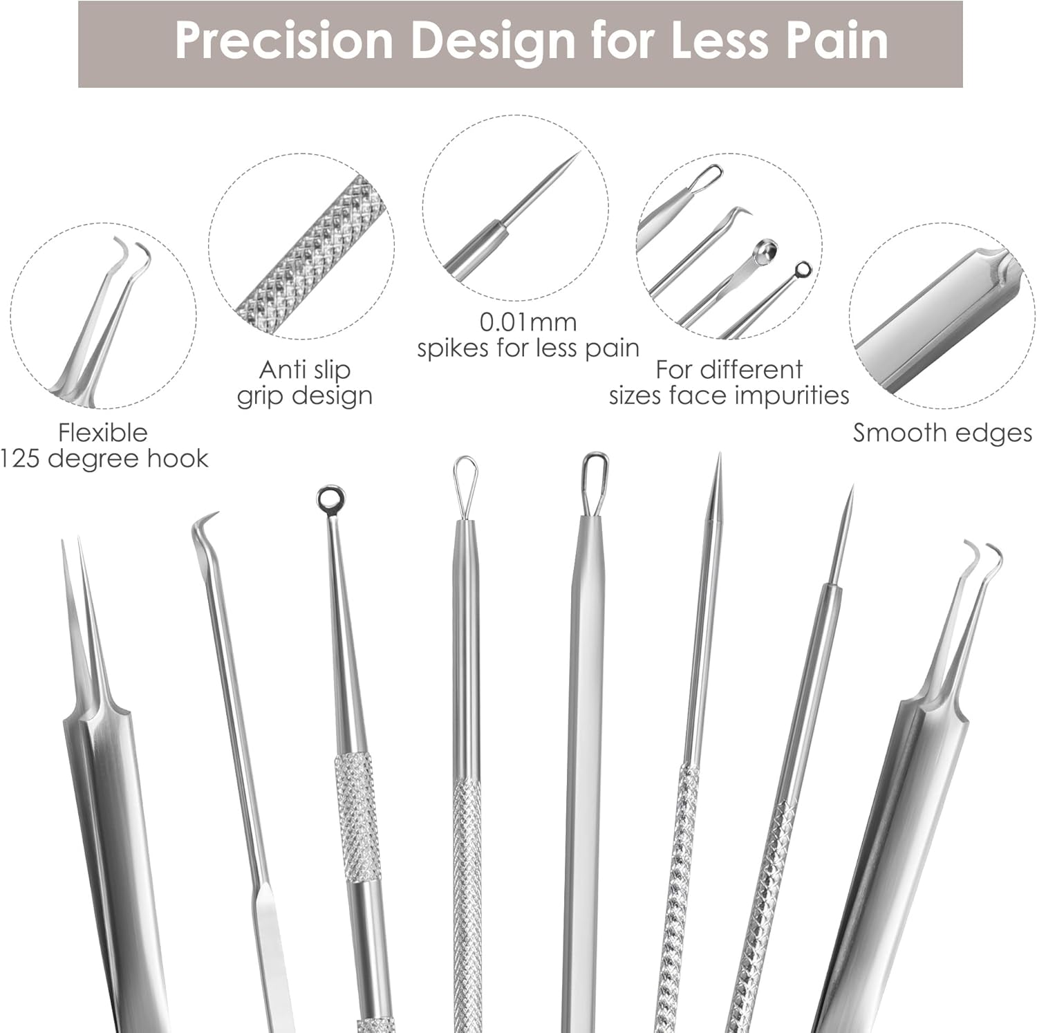 Superieure kwaliteit: alle gereedschappen zijn gemaakt van roestvrij staal, gemakkelijk schoon te maken, kunnen worden gebruikt voor verschillende huidtypes (vette, zachte of droge huid), je kunt ze gemakkelijk controleren en beschadigt de huid niet.