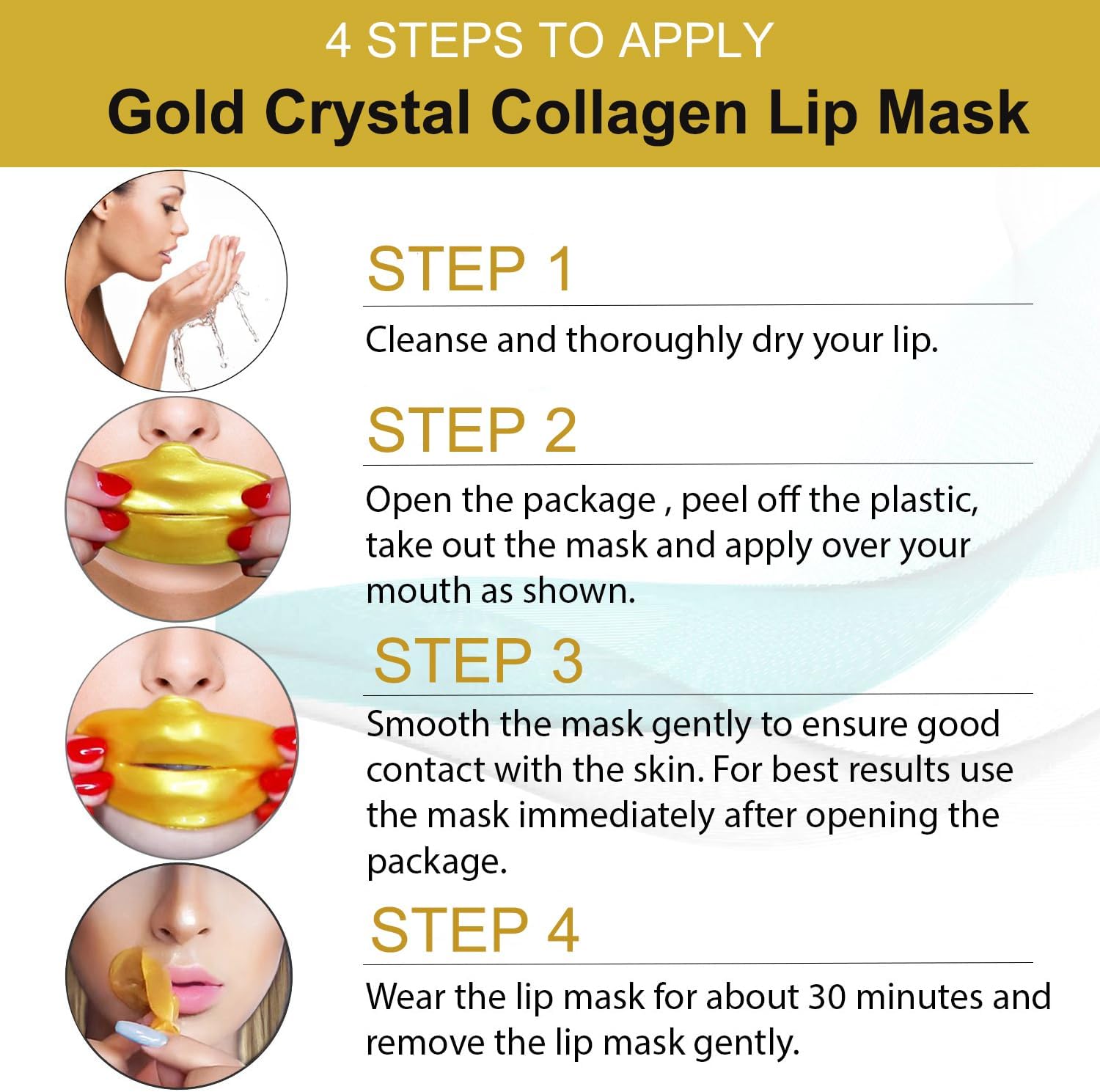 Set van 15 gouden collageen-lippenmaskers. Deze maskers bevatten: aqua, glycerine, propyleenglycol, collageen, glycerylstearaat, trehalose, mica, rozenextract, allantoïne, hyaluronzuur, slib, fenoxyethanol. Kan droge en gebarsten lippen behandelen, verjongen:
