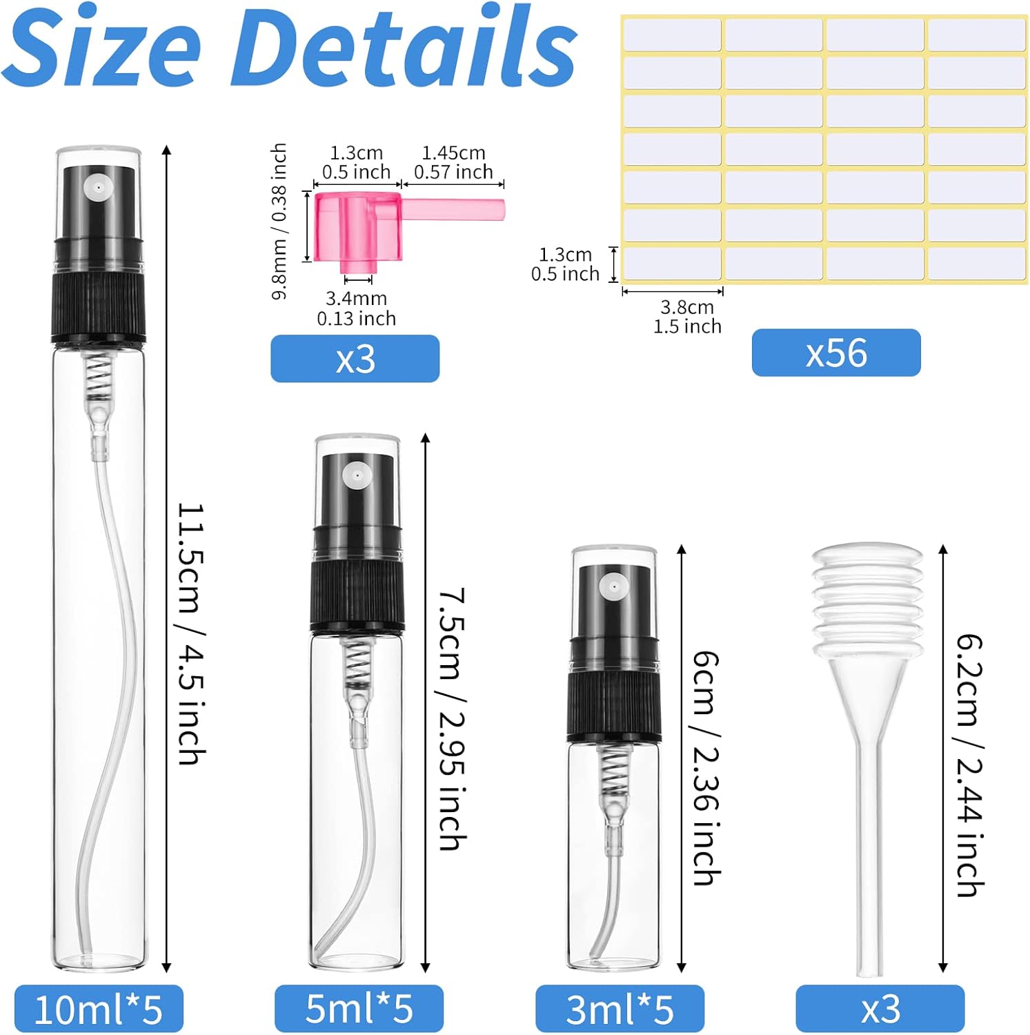 Verpakking: het pakket bevat 15 stuks draagbare spuitflessen van glas van 3 ml, 5 ml en 10 ml, 5 stuks van elke grootte. Voldoet aan je verschillende behoeften.