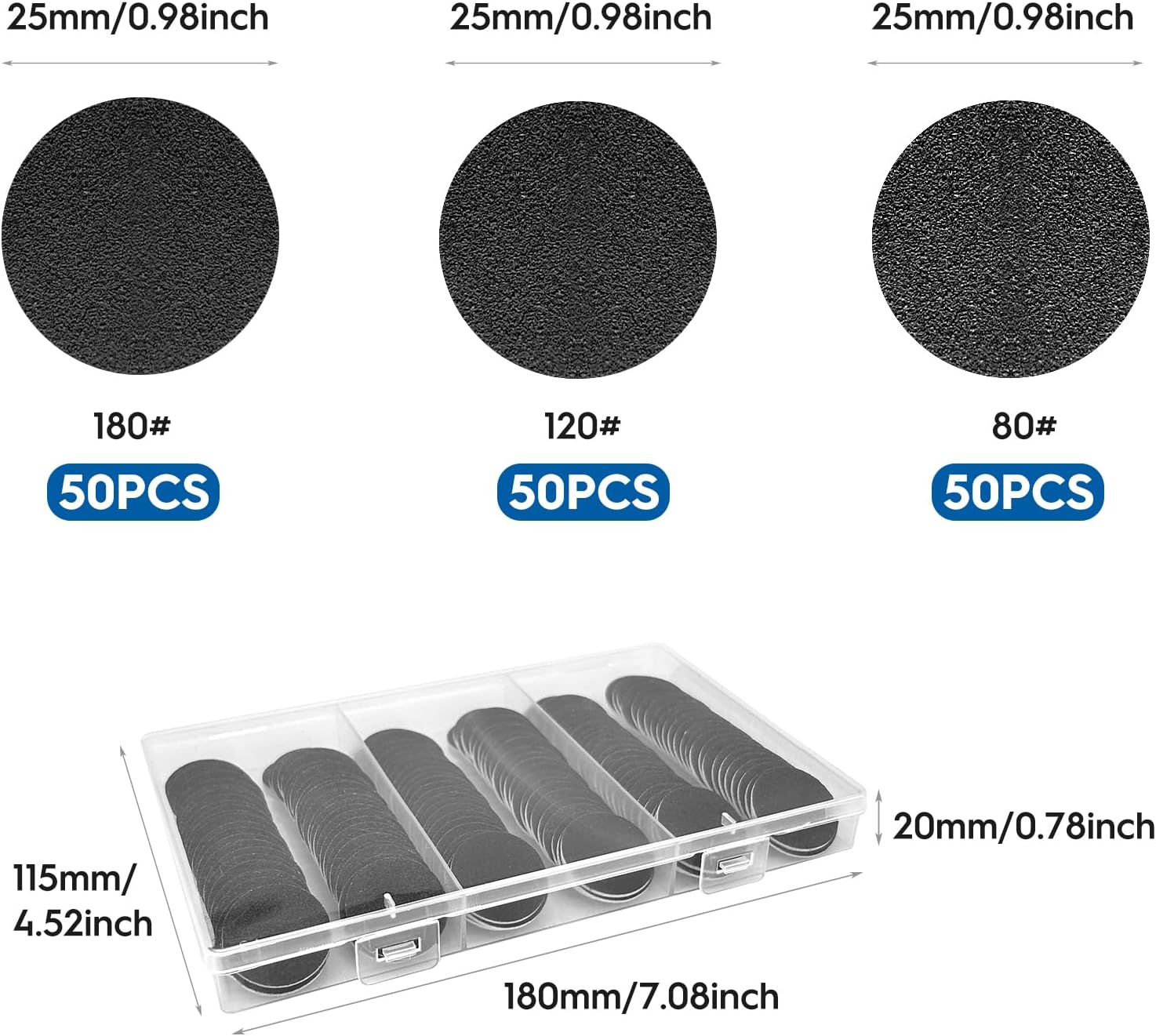 3. 【Package Including】: Package includes 50 pieces 80# x 25mm black grinding discs, 50 pieces 120# x 25mm black grinding discs, 50 pieces 180# x 25mm black grinding discs, and a transparent plastic box.