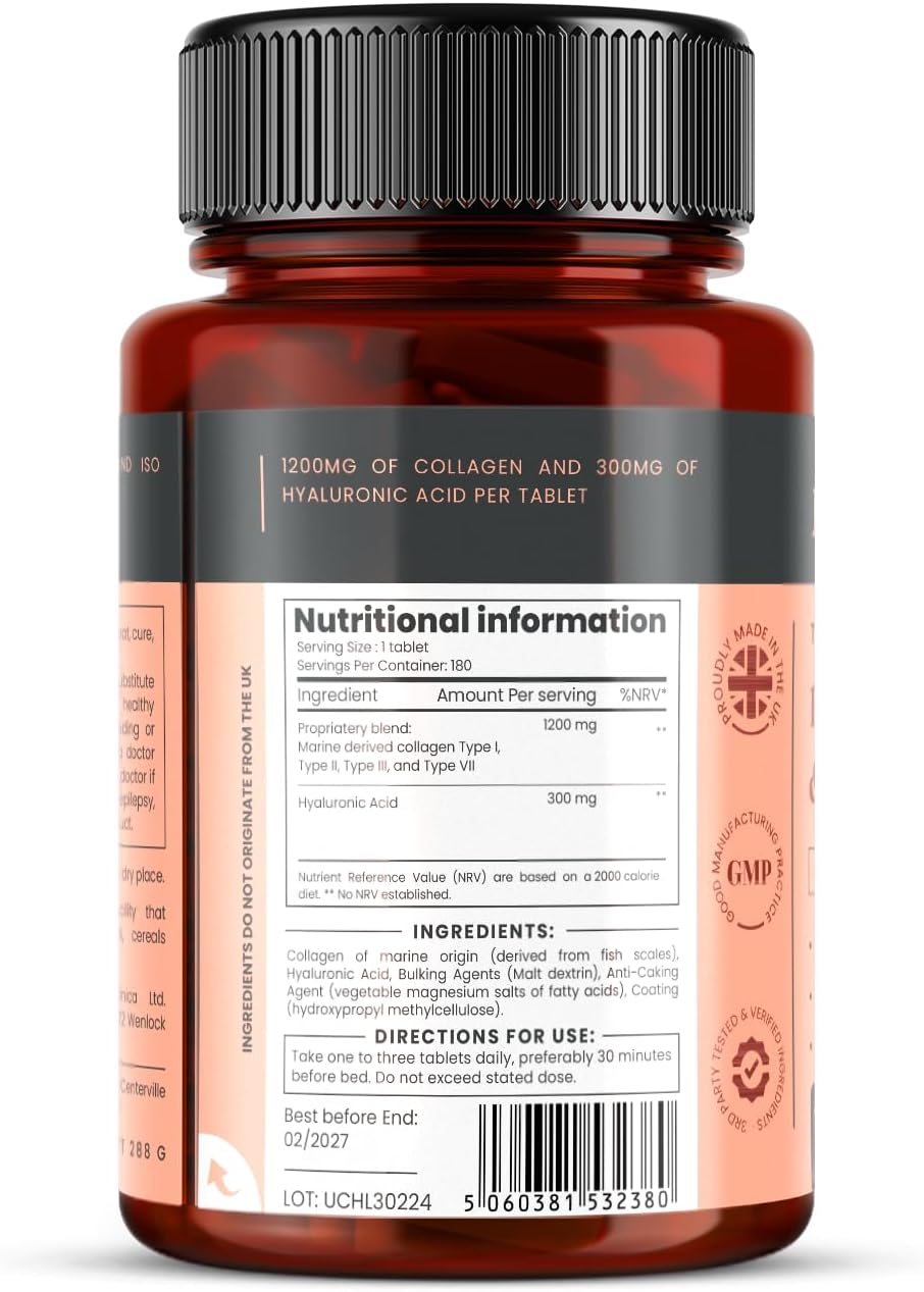 1500mg x 360 tabletten. 1200mg UltraColl Collageen en 300mg Hyaluronzuur per tablet. (2 flessen van elk 180 tabletten – voorzien van 12 maanden).