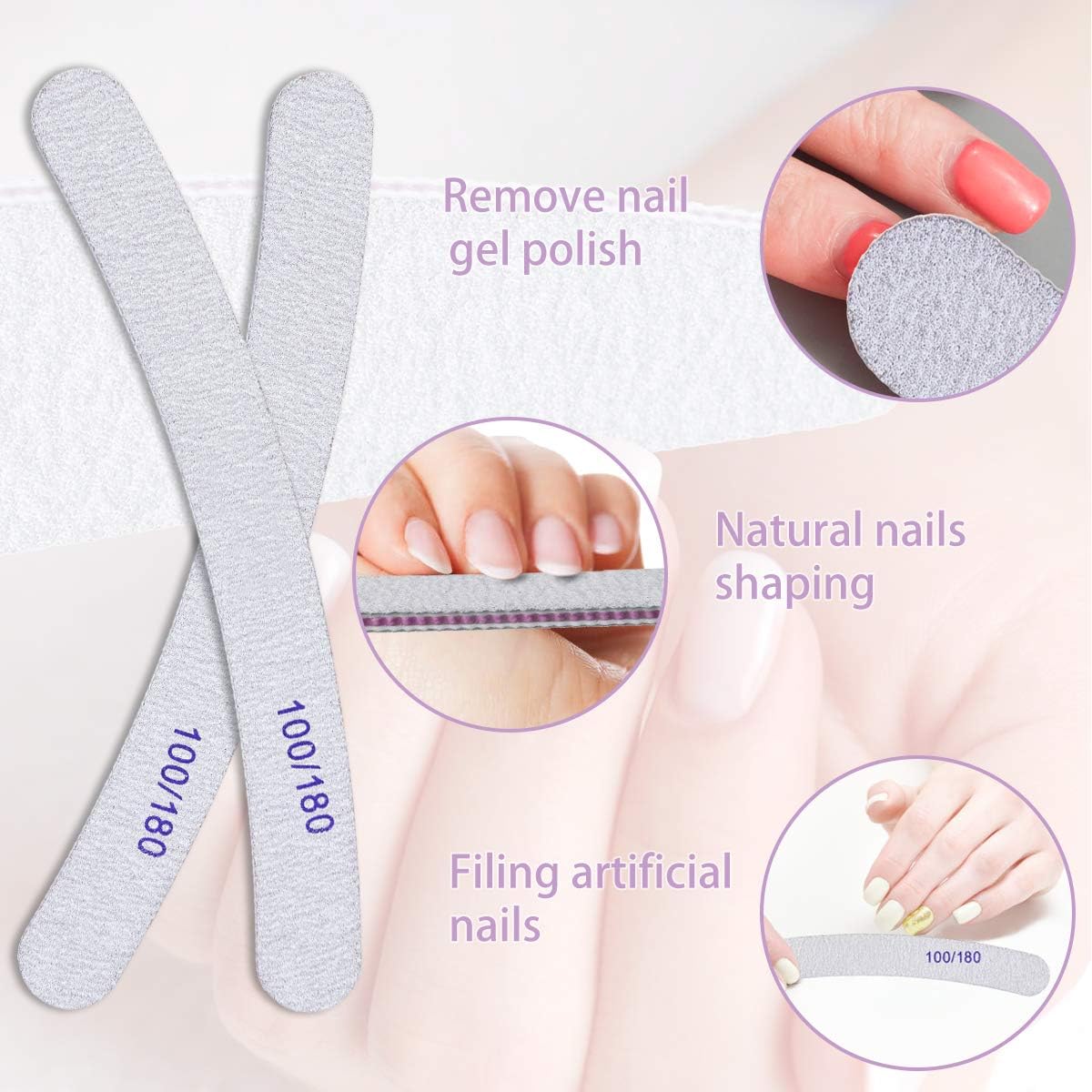 👩🦰【Dubbelzijdige korrel】 100 korrel nagelvijlset, gebruikt om harde nagels en teennagels te vijlen, nagelgel te verwijderen en de nagelbedekking te polijsten; 180 Grit-zijde is handiger voor het trimmen van de rand van de nagel en het verbeteren van de vorm, geschikt voor natuurlijke of acrylnagels, en ook geschikt om uw huisdier te helpen nagels te polijsten.