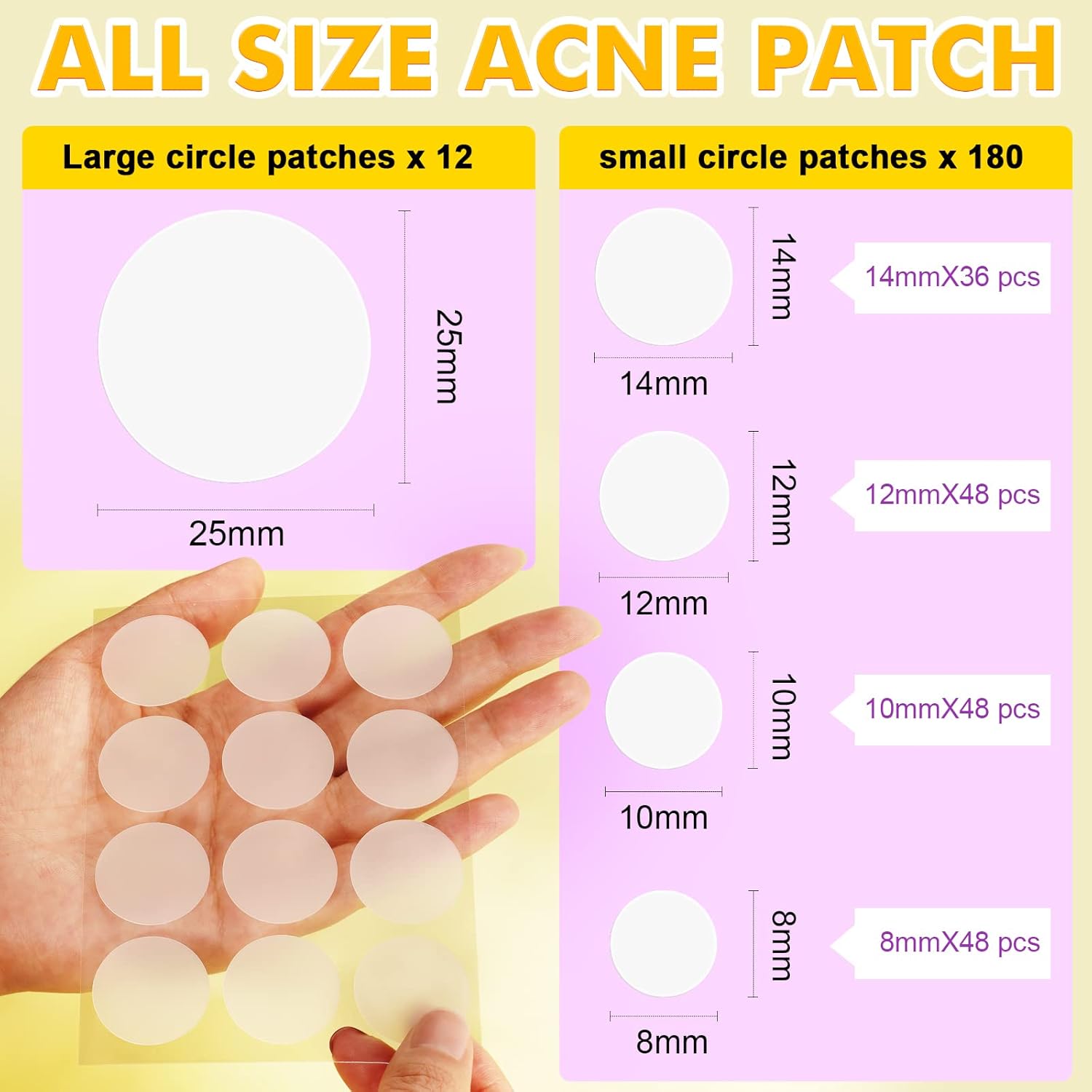 【192 stuks en grootte】: deze set bevat 192 stuks puistjespleisters. Er zijn 5 verschillende maten: 192 patches: 8 mm x 48 stuks, 10 mm x 48 stuks, 12 mm x 48 mm, 14 mm x 36 stuks, 25 mm x 12 stuks, voor meer opties.