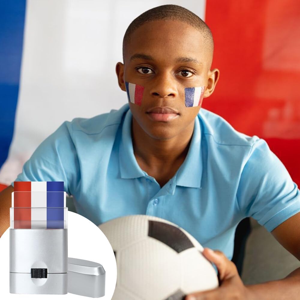 Geschikt voor alle gelegenheden: of het nu voor het rugby-wereldkampioenschap, het wereldkampioenschap voetbal of andere sportevenementen is, deze driekleurige make-up begeleidt je met stijl en enthousiasme. Compact en licht, slechts 28 gram, past gemakkelijk in een tas en is gemakkelijk mee te nemen.