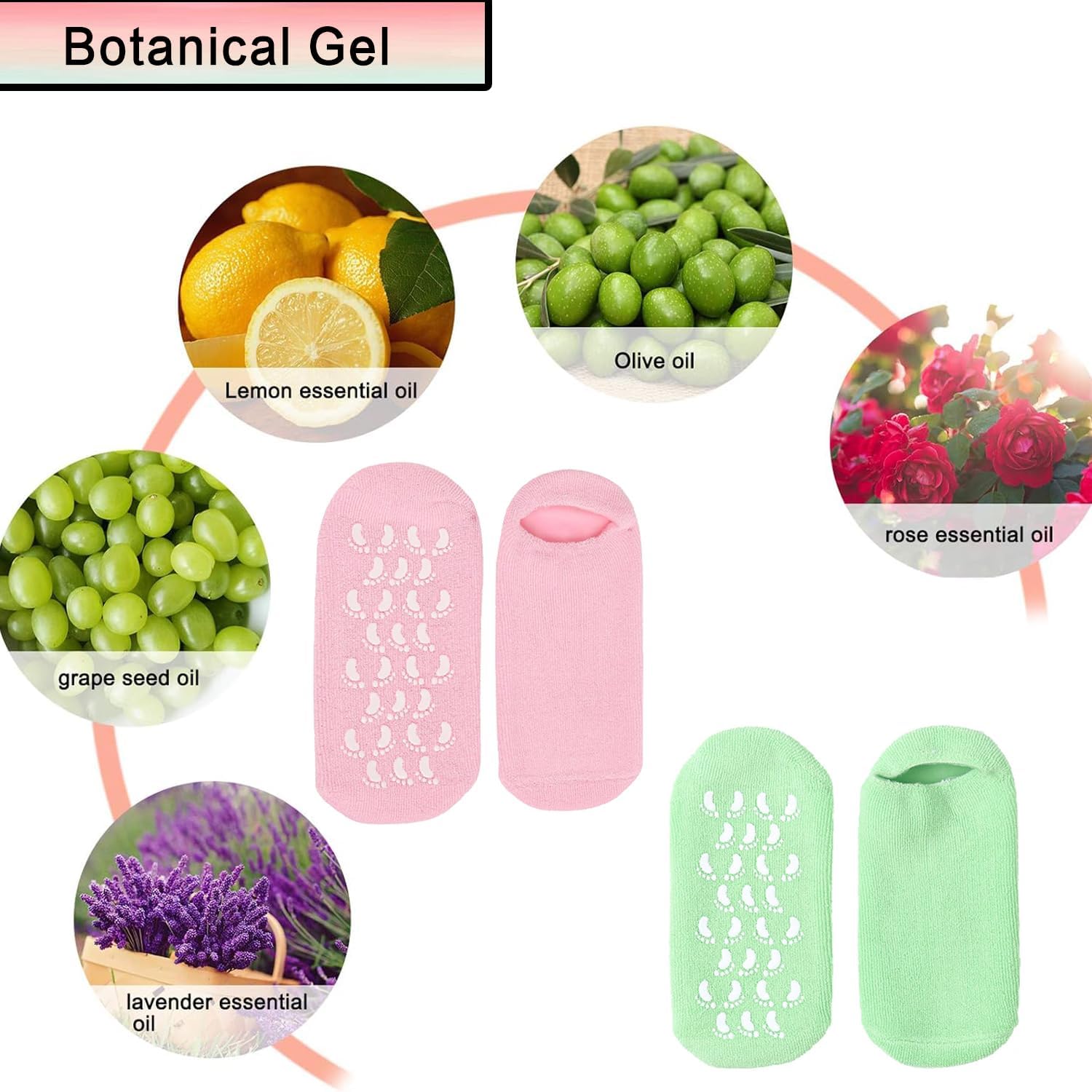 Gel lining: gel socks use a specially formulated gel liner rich in vitamins and essential oils (jojoba oil, grape seed oil, olive oil, etc.)