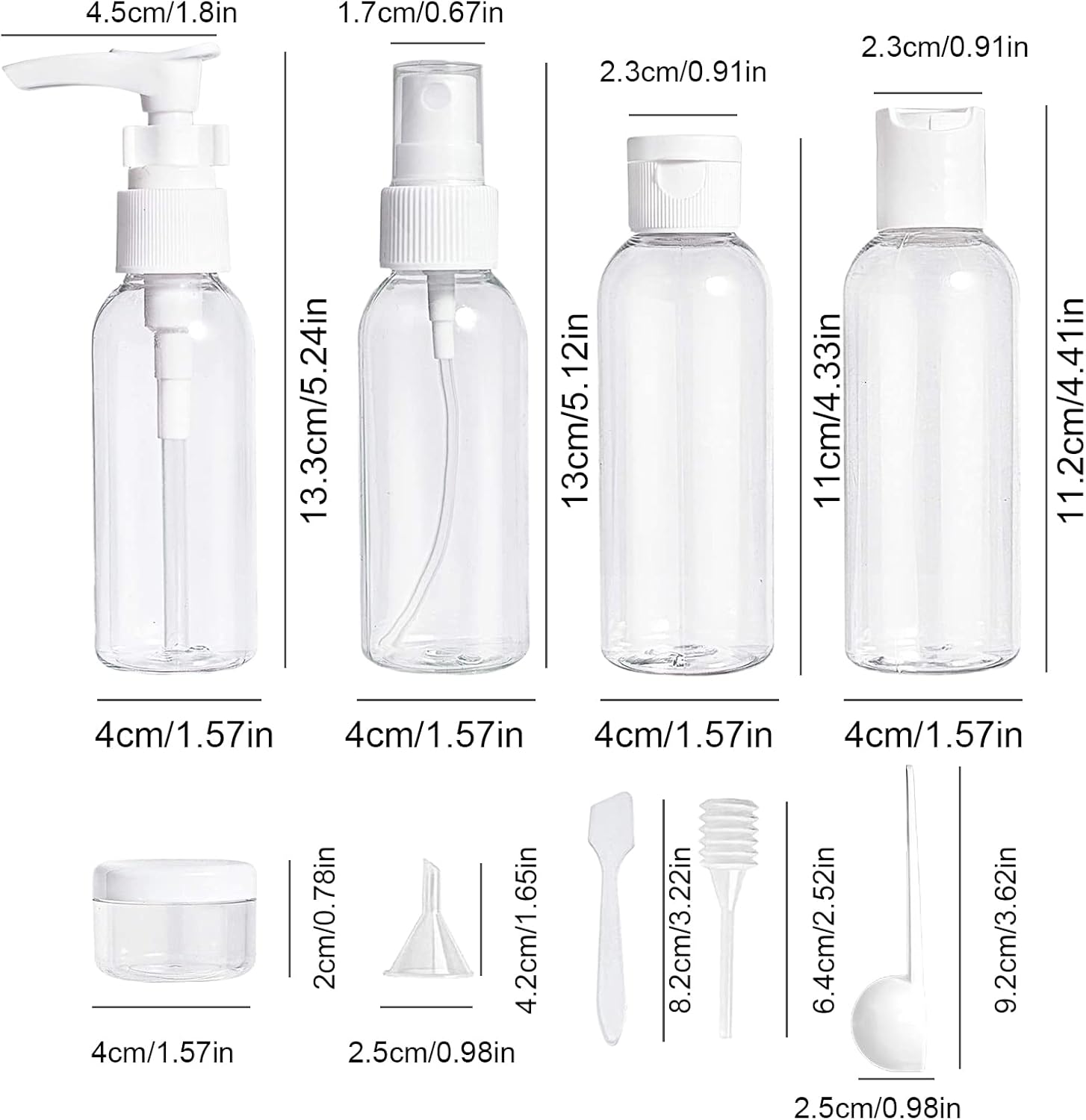 Je krijgt: reisflessenset bevat 2 stuks 80 ml flip-cap fles, 2 stuks 80 ml pompfles, 2 stuks 50 ml spuitfles, 2 stuks 50 ml schroefdop fles, 4 stuks 10 g crèmepotten, 2 stuks 10 ml maatlepel, 2 stuks pipetjes, 2 stuks trechter, 2 stuks spatel, onze reistoiletartikelen kit is perfect voor uw cruisereizen, zakenreis enz.