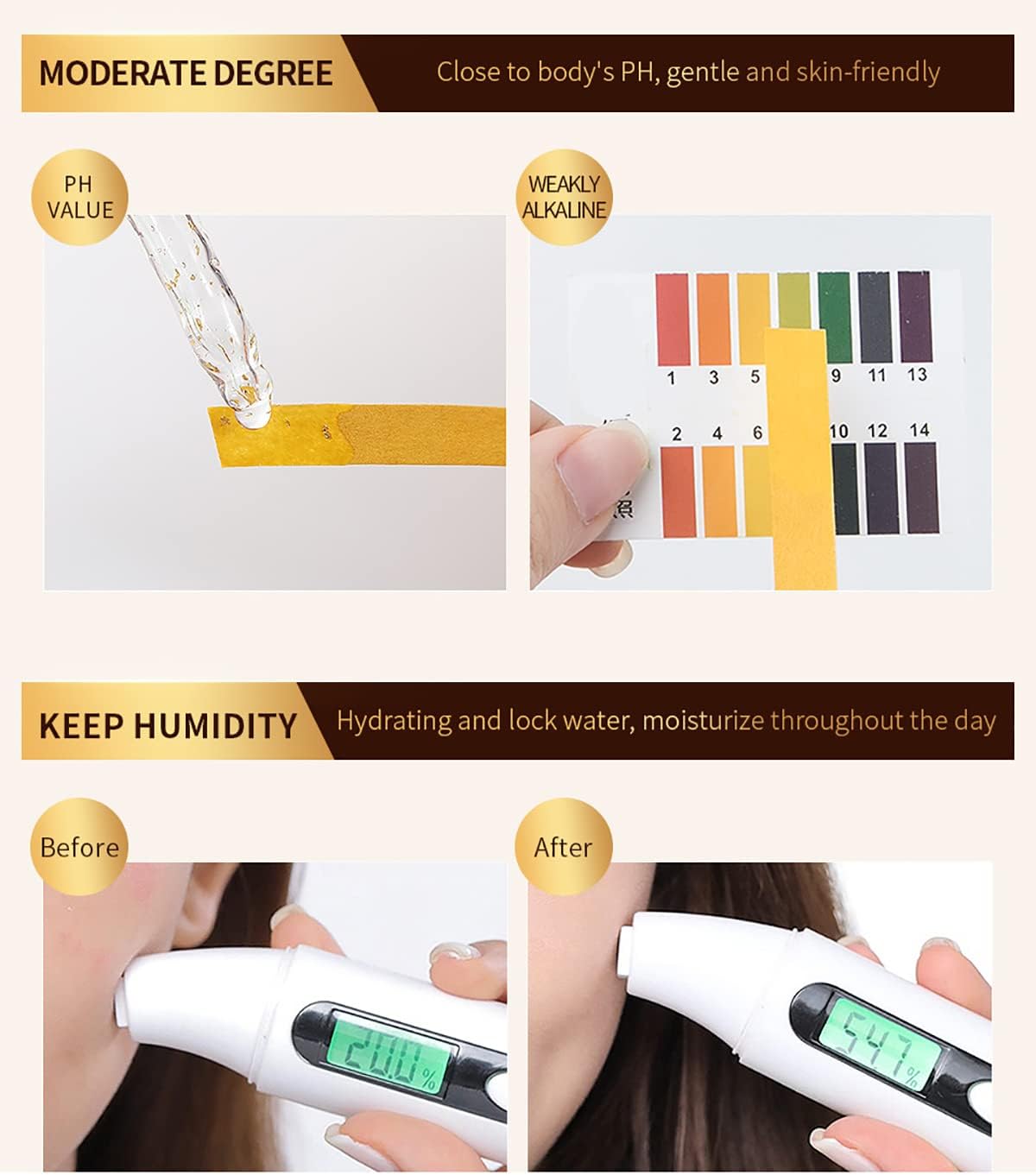 Hydraterend: Nadat de goudfolie volledig is opgenomen, wordt de huid diep gehydrateerd. De unieke voedende en hydraterende ingrediënten kunnen de droge, ruwe en doffe huid effectief verbeteren, waardoor de huid zacht wordt als parels.