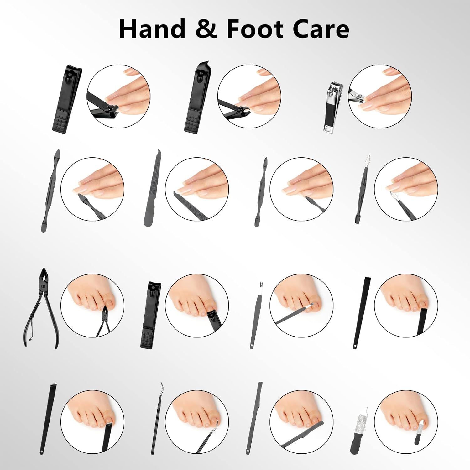 Hoogwaardig roestvrij staal: de manicure en nagelknipper kit is gemaakt van hoogwaardig roestvrij staal. De gereedschappen zijn allemaal scherp en zeer duurzaam, zonder te roesten. Ze zijn eenvoudig te bedienen en duurzaam, ontworpen voor levenslang gebruik. (Tip: verwijder de blauwe beschermfolie van de rand van de opbergzak om de roestvrijstalen rand zichtbaar te maken.)