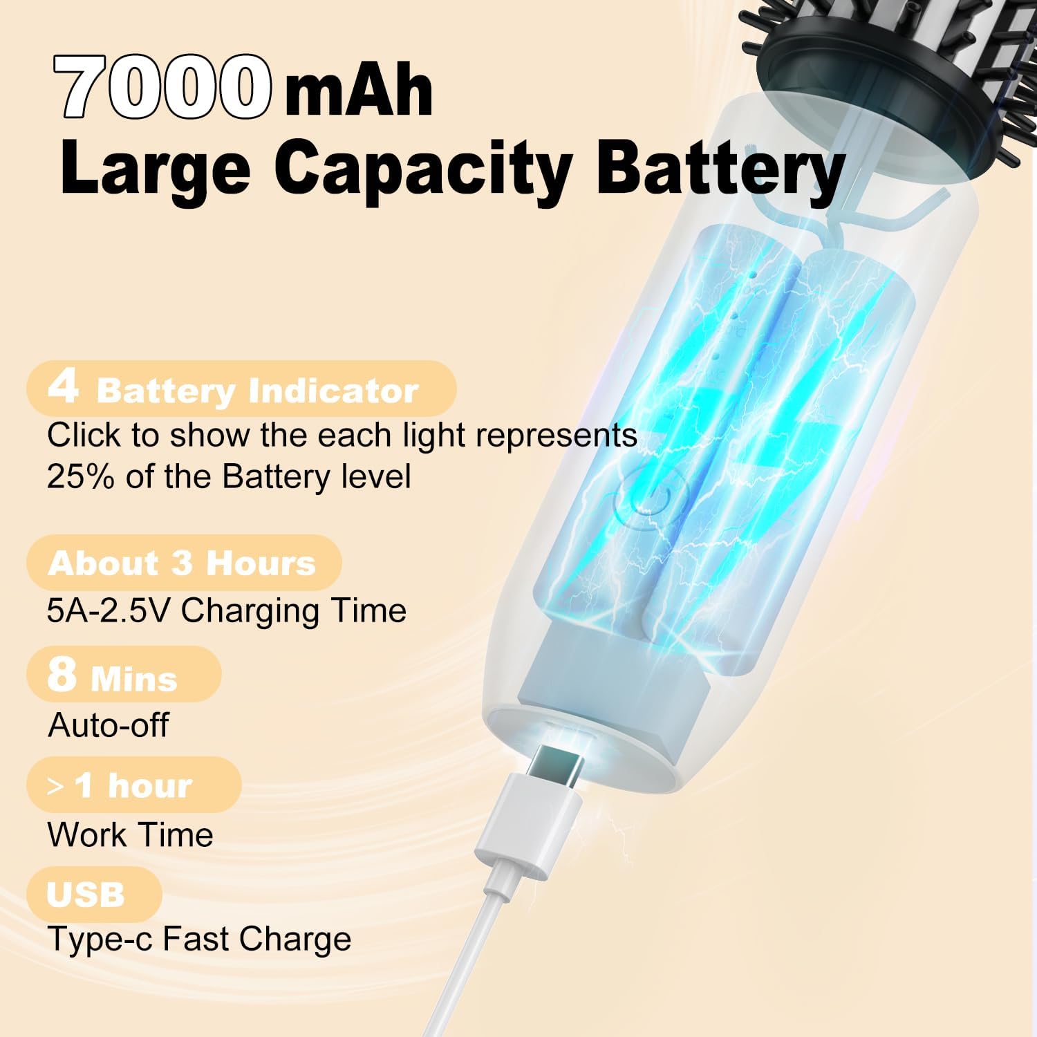 Draadloos ontwerp: met de batterij van 7000 mAh, handig en snel draadloos ontwerp, snelle verwarming in 90 seconden, automatische constante temperatuur, vermindert haarschade. Laad voor gebruik volledig op. Je kunt je haar altijd en overal stylen, het is een complete reisgenoot voor je haar.