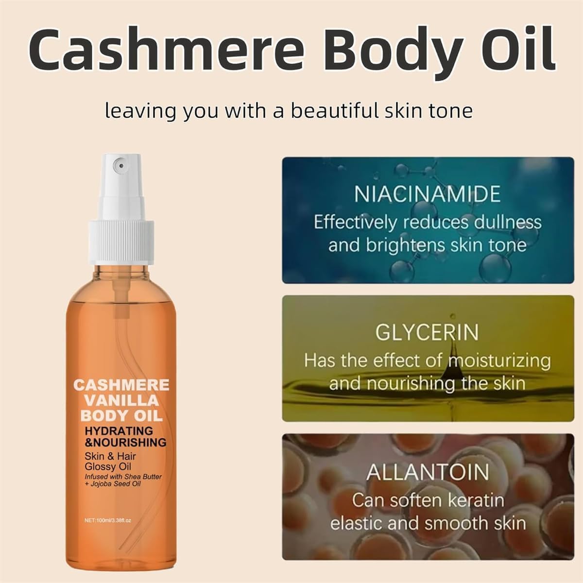 3 PCS Vanilla Cashmere Body Oil, Cashmere Vanilla Body and Hair Oil, Shea Butter with Jojoba and Radiance Oil, Vanilla Cashmere Lotion Mist Spray, Brightens Skin and Reduces Dark Spots
