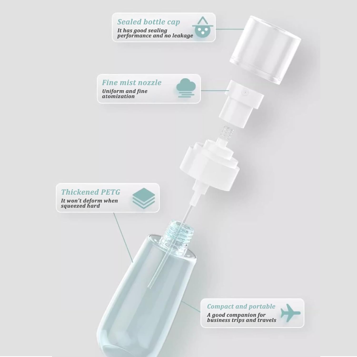 Fine Mist Sprayer: Levert een consistente, ultrafijne nevel die perfect is voor het gelijkmatig aanbrengen van parfums, toners of gezichtsnevels zonder te druppelen of te veel te spuiten.