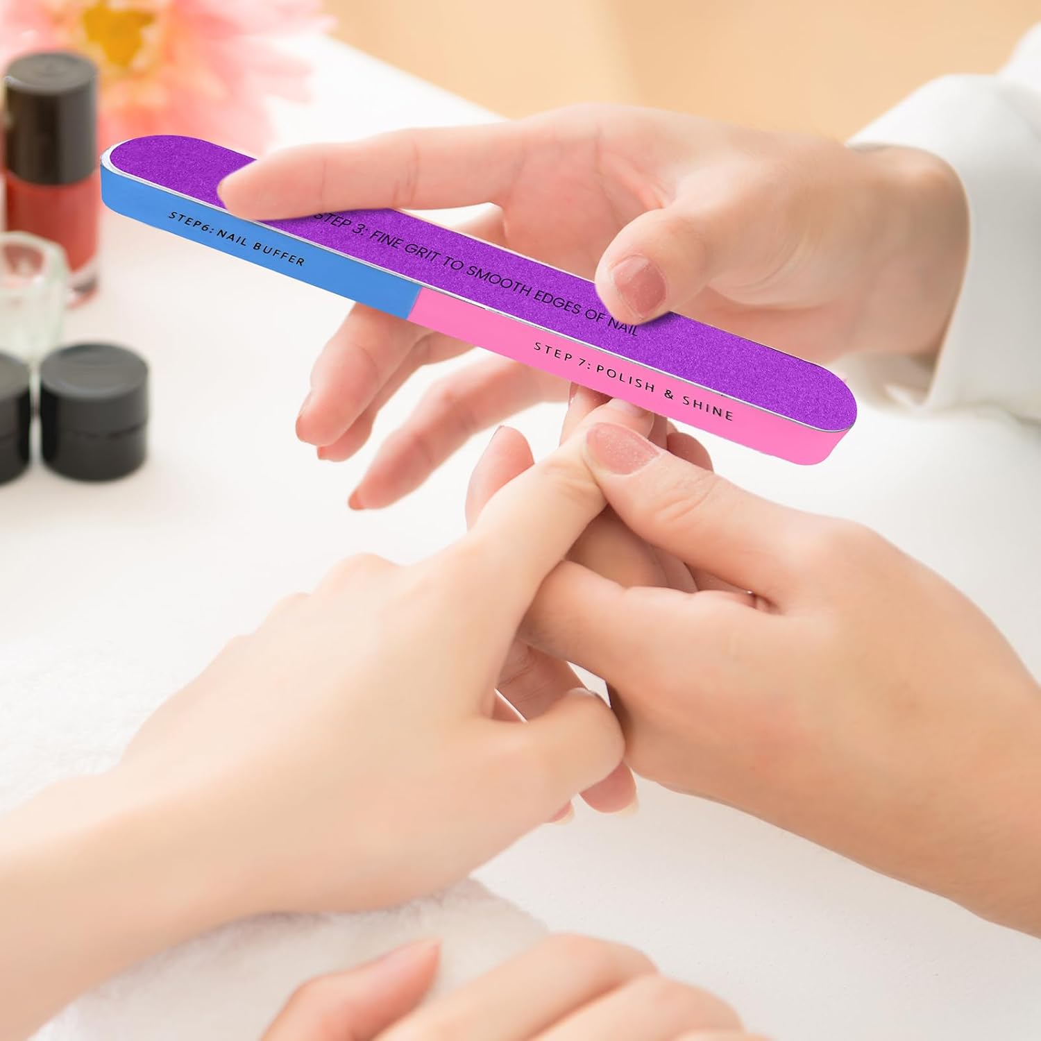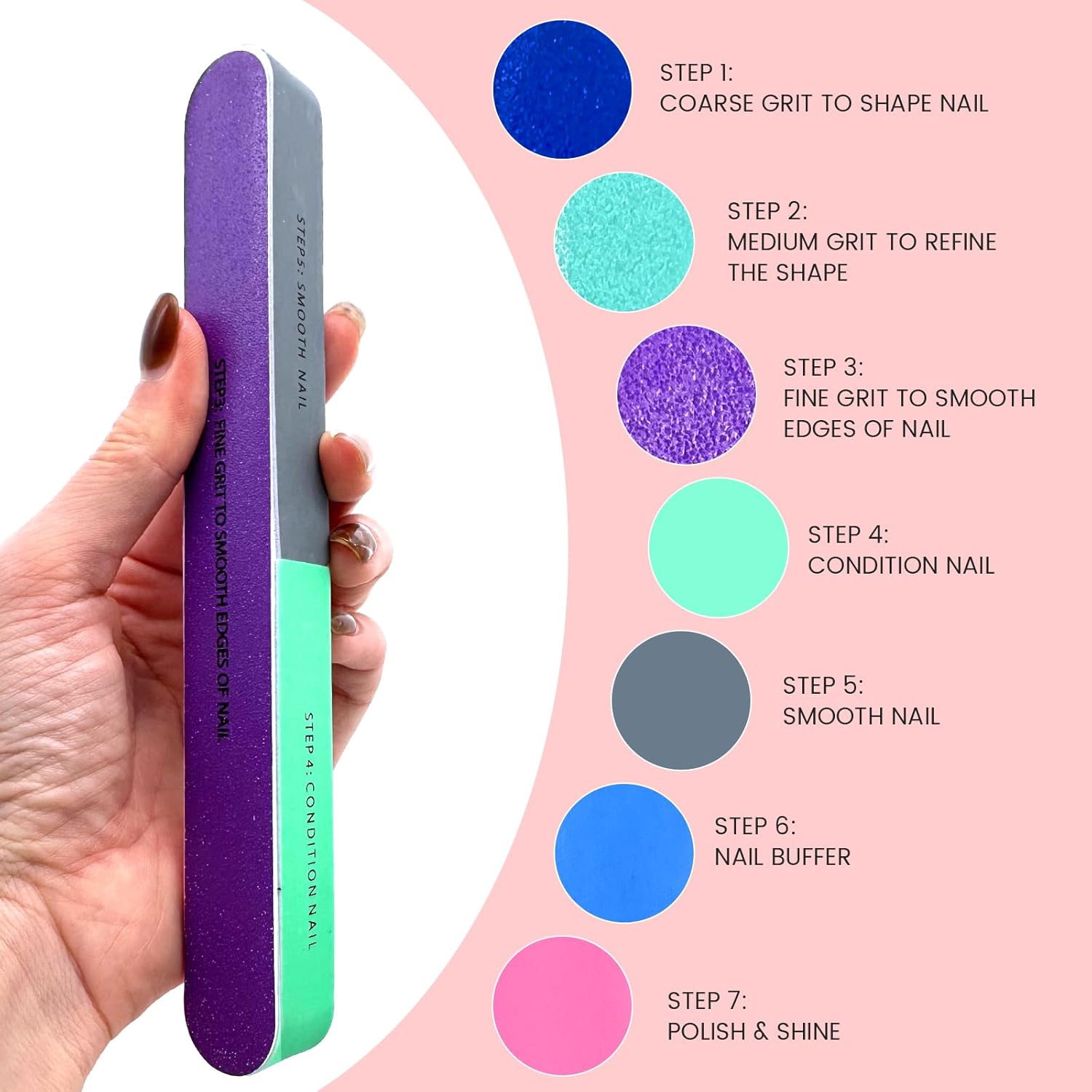 Veelzijdig inzetbaar: 7 soorten oppervlakken in 7 verschillende kleuren hebben 7 stappen voor het vijlen en polijsten van nagels. Elk oppervlak heeft verschillende korrelgraden. Elke pagina is genummerd voor de te gebruiken stap en toont de gedetailleerde functie van elk oppervlak.