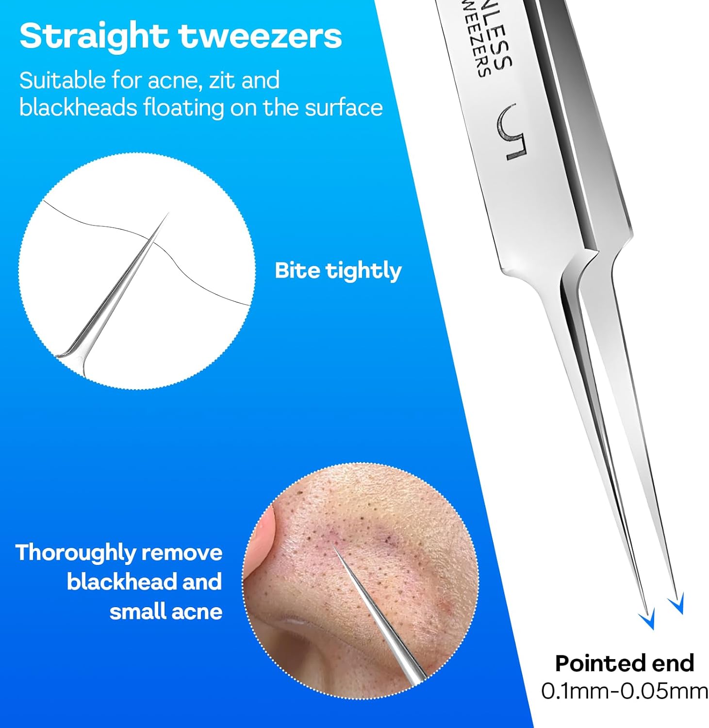 Veilige en nauwkeurige verwijdering: het pincet voor milienverwijderaar en de andere gereedschappen in de set zijn zo ontworpen dat ze een veilige en nauwkeurige verwijdering van mee-eters mogelijk maken. Het gladde oppervlak van het roestvrij staal vermindert wrijving en het risico op huidirritatie. Een must – voor iedereen die om zijn huidgezondheid geeft.