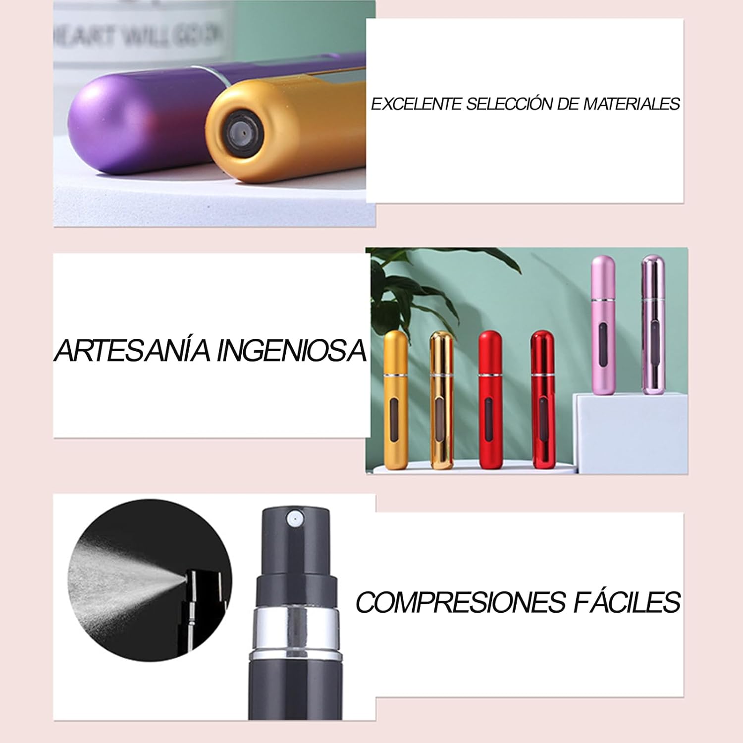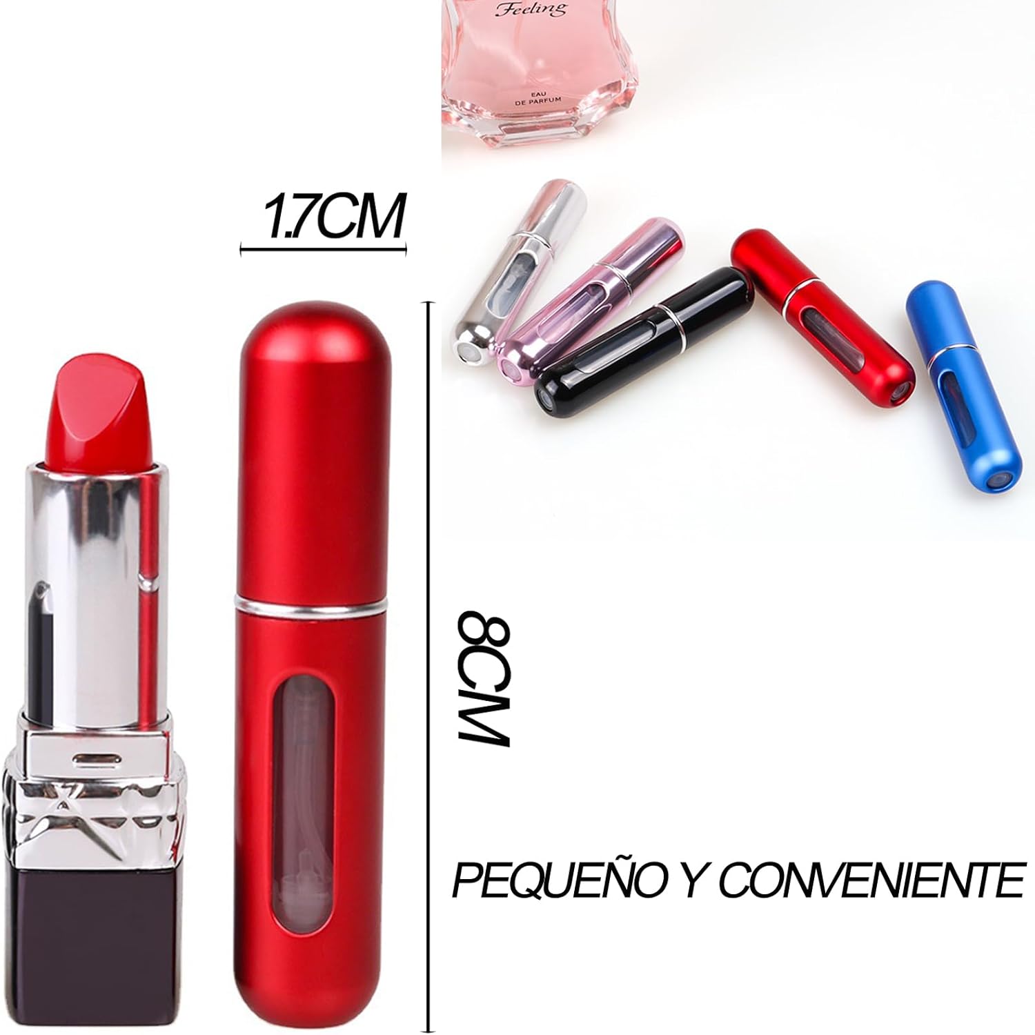 El paquete contiene 4 frasquitos de aluminio y color metalizado por fuera. Tiene una pequeña ventana transparente por la que s puede ver cuánto perfume queda, eso me ha gustado.Es muy pequeño, caben 5 ml, asíq ue está genial para llevar en el bolso o incluso en el bolsillo.Es muy fácil de recargar, simplemente hay que quitar la cabeza del pulverizador del frasco grande de perfume dejando a la vista el tubito blanco, se apoya ahí la parte de abajo del mini perfumador y se bombea.Los colores son bonitos, dos tonos de rosa, plateado y negro, uno de cada uno de estos colores.Parece resistentes.