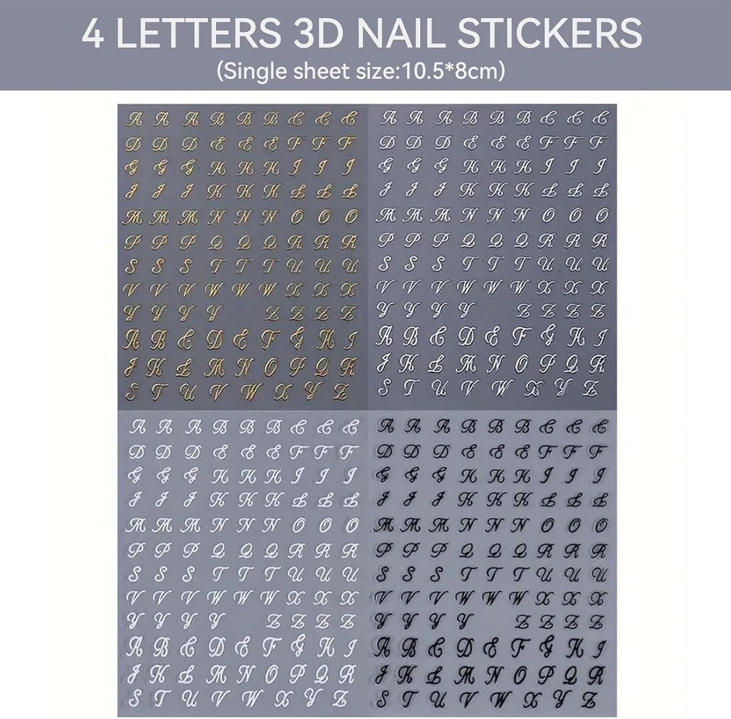 4 vellen nagel stickers met Engels retro letters voor nail art, 3D, zelfklevend, design, nagel stickers, Pegatinas Uñas, letter nail art stickers voor vrouwen