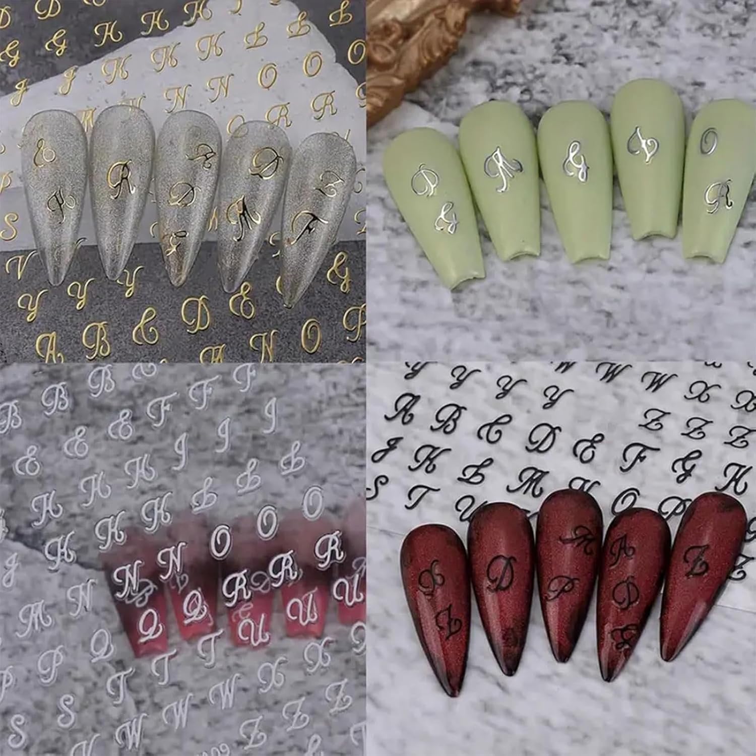 Letter nail art stickers: Je ontvangt 4 vellen nagelstickers met 3D lettermotieven en gepersonaliseerde letterpatronen die geschikt zijn voor de meeste natuurlijke en kunstnagels en waarmee je je eigen nail art, nageldesign, highlights en andere designelementen kunt maken.